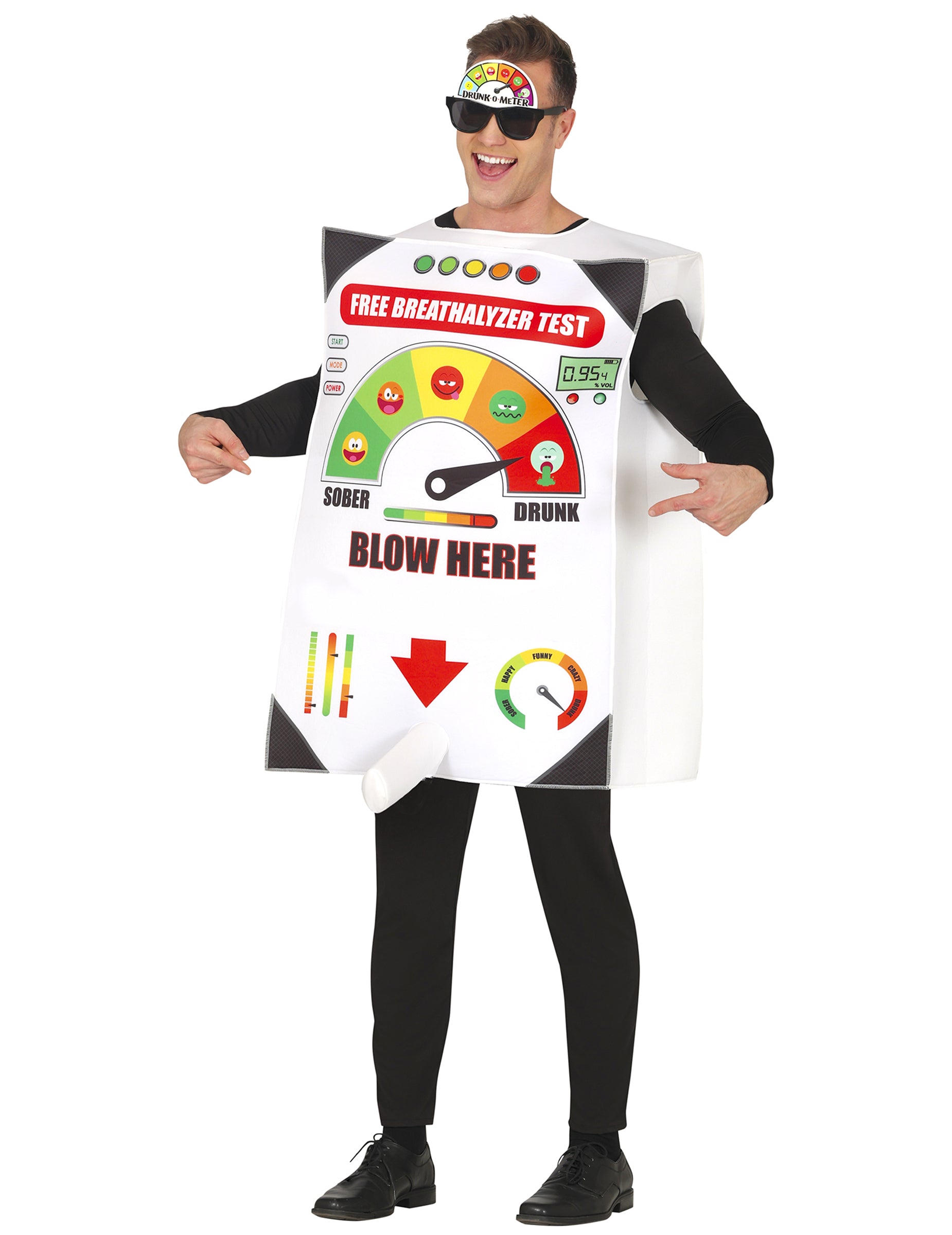 Tento humorný policajný kostým v tvare alkoholtestera pre dospelých sľubuje večer plný smiechu. V podobe obrovského alkoholtestera má kostým farebný ciferník od „Sober“ po „Drunk“ s výraznými emotikonmi a stredovou šípkou.