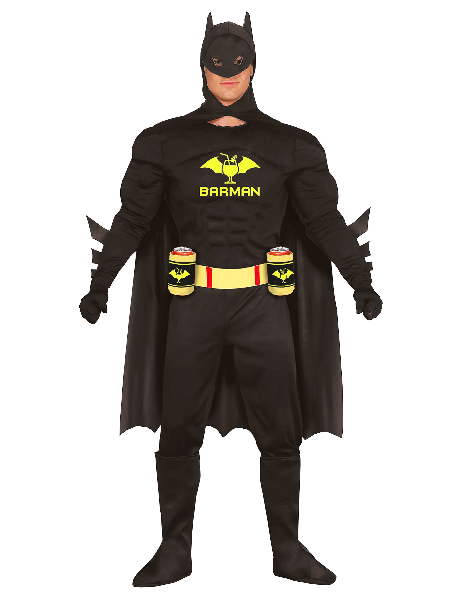 Tento dospelý barmanský kostým premení maskovaného hrdinu na kráľa párty. Čierny overal s efektom svalnatých svalov je ozdobený žltým logom barmana, čo je svojrázny odkaz na jeho humorný náprotivok. Jeho splývavý plášť, opasok s držiakmi na poháre a zodpovedajúca maska dotvárajú tento originálny a slávnostný vzhľad. Pohodlný a ľahko sa nosí, kombinuje štýl a humor, aby z vás urobil hviezdu okamihu. Perfektný kostým na maškarný večierok, karneval alebo rozlúčku so slobodou.