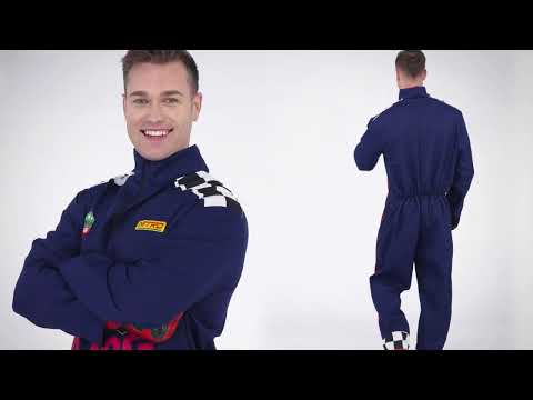Tento kostým pretekárskeho pilota pre dospelých vás premení na skutočného šampióna okruhov. Kombinéza v tmavomodrej farbe je zdobená potlačenými detailmi v štýle sponzorov, logom Racing a šachovnicovými motívmi na pleciach a členkoch, ktoré pripomínajú vlajky cieľa pretekov.
