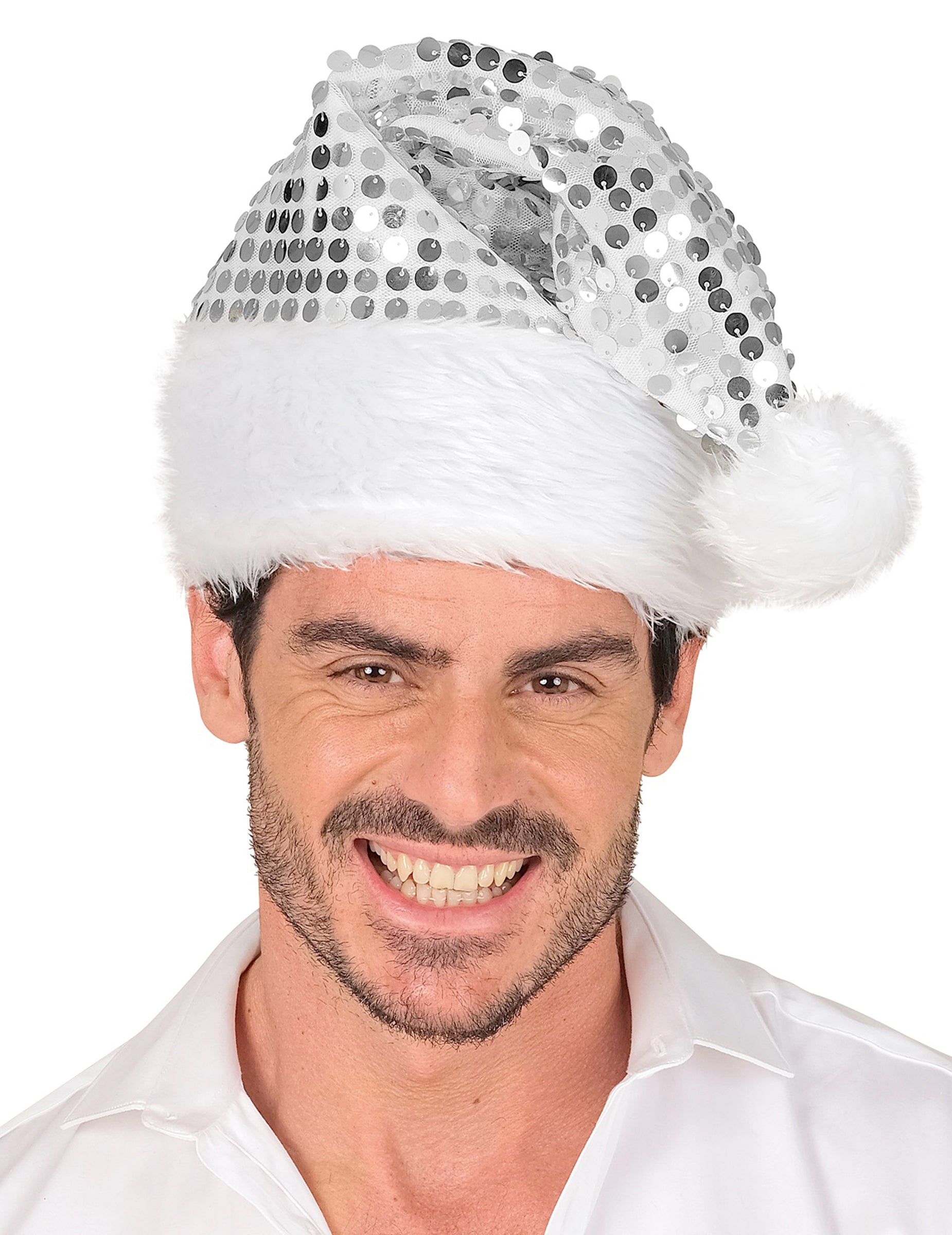 Toto strieborná flitrovaná vianočná čiapka Tento doplnok pre dospelých kombinuje eleganciu a trblietanie a rozžiari vaše sviatočné oslavy. Je kompletne ozdobený trblietavými striebornými flitrami, ktoré odrážajú svetlo a vytvárajú neodolateľne žiarivý efekt. Jeho biely lem z umelej kožušiny a nadýchaný brmbolček dodávajú jemný zimný nádych.