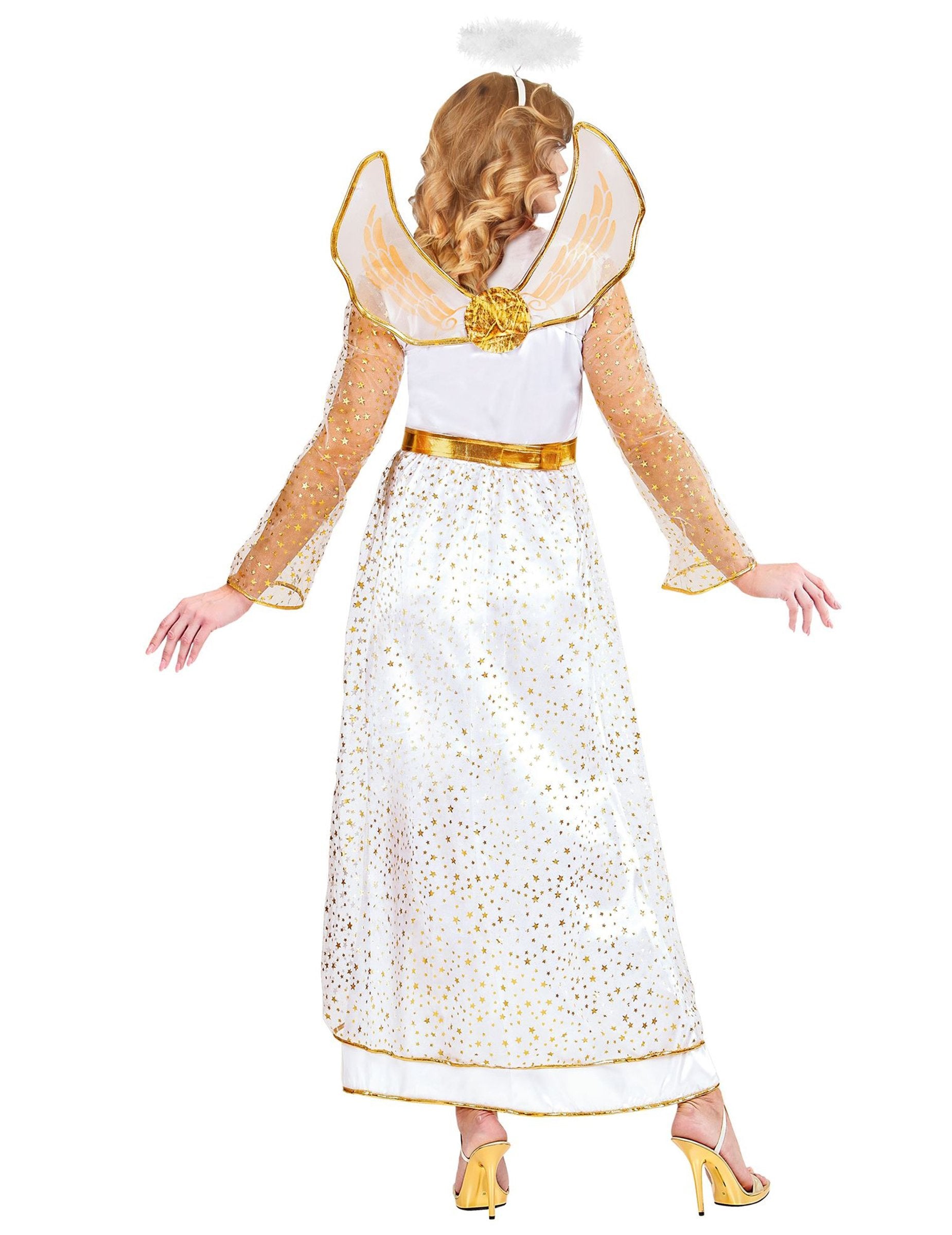 Tento bielo-zlatý anjelský kostým pre ženy dodá vašim oslavám nebeský nádych. Dlhé biele šaty sú doplnené trblietavými zlatými závojmi a zlatým opaskom, ktoré vytvárajú žiarivý a elegantný efekt. Trblietavé priehľadné rukávy dodávajú kompletu éterickú jemnosť. Zlaté krídla a biela svätožiara dopĺňajú tento božský outfit, ideálny na stvárnenie dobrotivého anjela na predstavení, vianočnom večierku alebo kostýmovej akcii.
