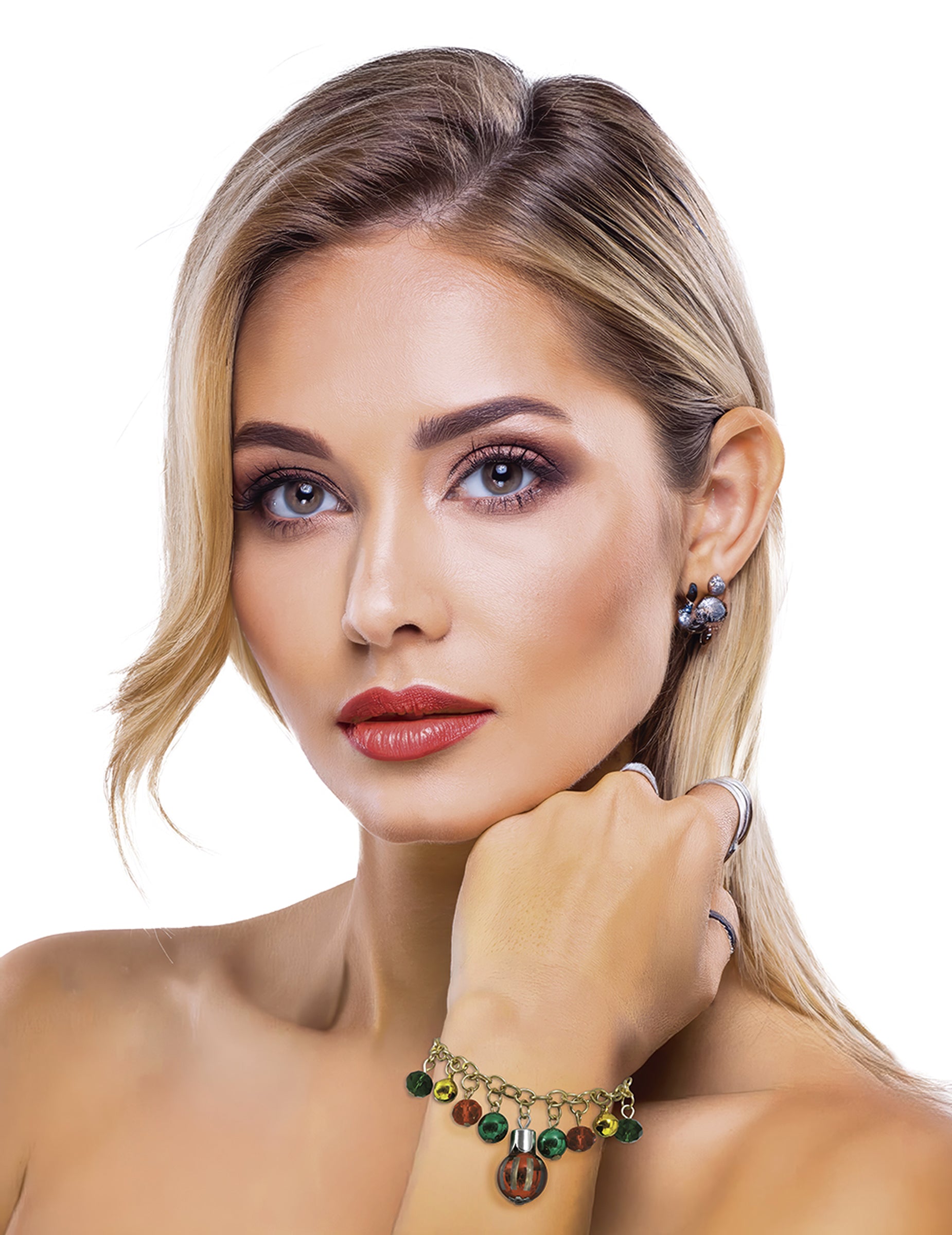 Tento kovový náramok s vianočnými guľôčkami je rafinovaným doplnkom, ktorý oslavuje kúzlo sviatkov s trblietkami. Jeho zlatá retiazka je ozdobená farebnými korálkami v odtieňoch červenej, zelenej a zlatej spolu s pruhovaným príveskom s guľôčkami, ktoré mu dodávajú žiarivý a slávnostný nádych. Vďaka nastaviteľnej spone sa ľahko prispôsobí vášmu zápästiu a zaistí dokonalé pohodlie. Ideálny na doplnenie elegantného vianočného outfitu alebo ako jedinečný a trblietavý šperk, ktorý zachytáva ducha sviatkov.