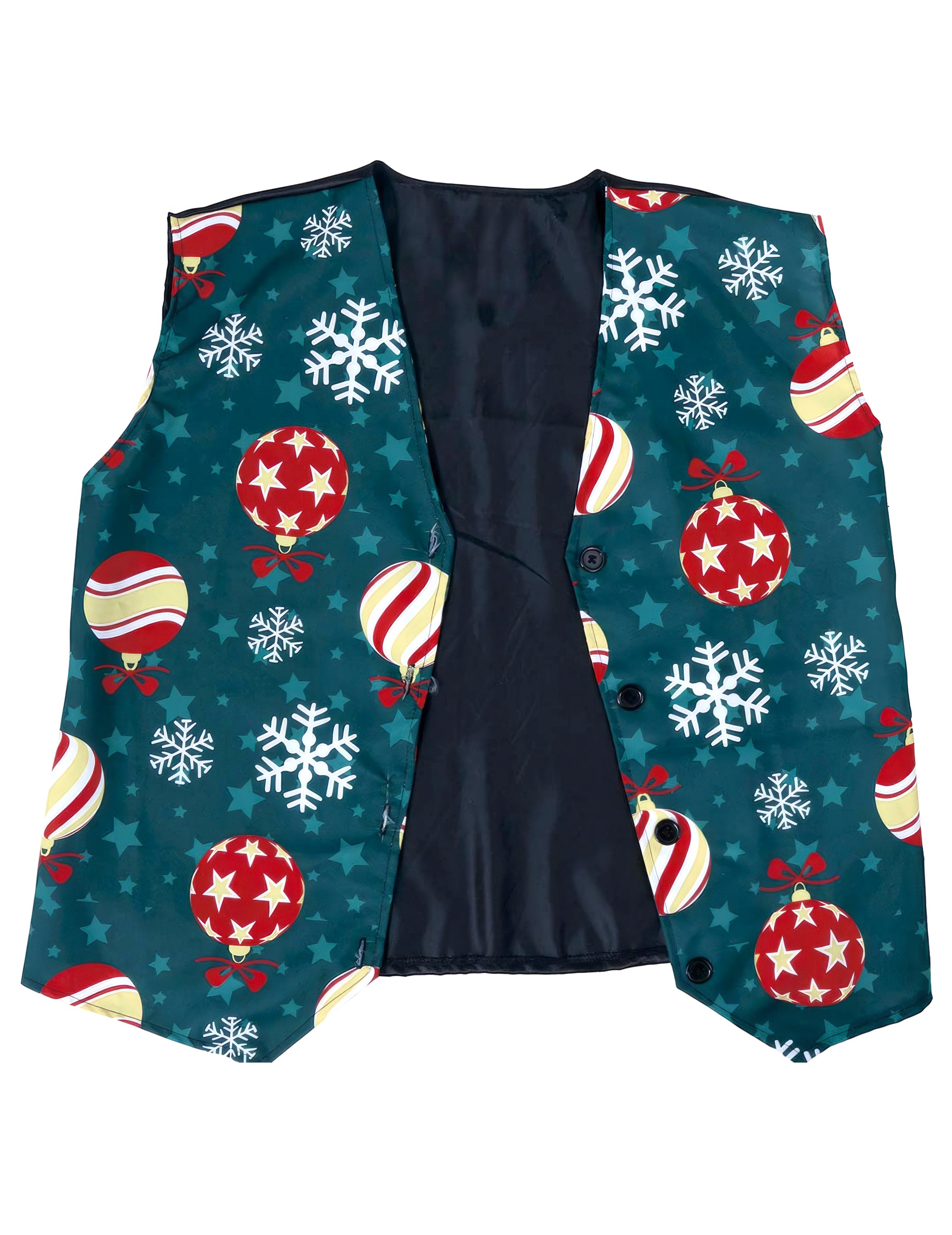 Tento vesta s motívom vločiek a vianočných gúľ pre dospelých má originálny a elegantný štýl. Na tmavozelenom podklade sa miešajú biele vločky a červené a zlaté gule v veselom a farebnom vzore, ideálnom na oslavu kúzla sviatkov.