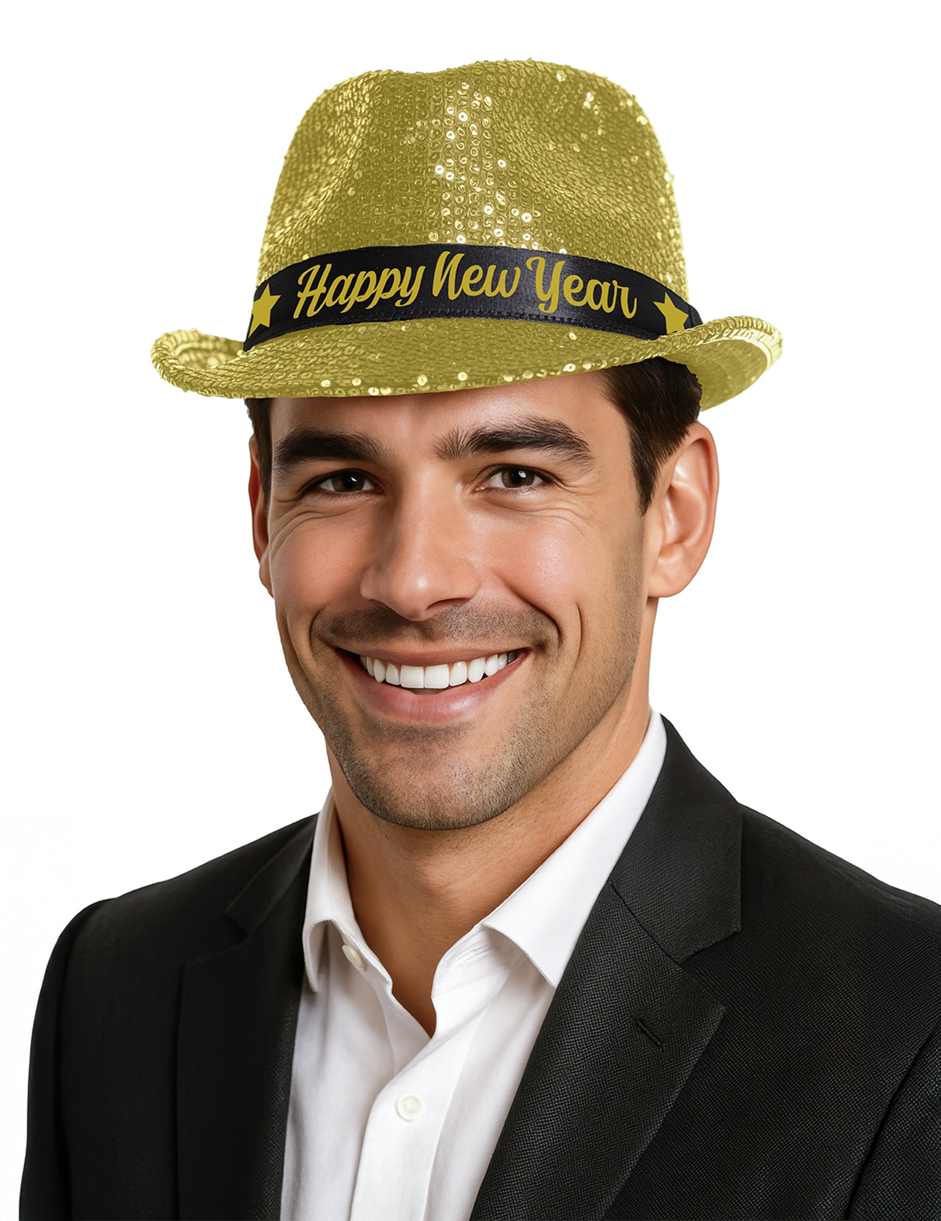 Táto zlatá flitrovaná čiapka je perfektným doplnkom na štýlovú oslavu Nového roka. Ozdobená čiernou stuhou s nápisom „Šťastný nový rok“ obklopeným zlatými hviezdičkami určite upúta pozornosť a okamžite dodá vášmu outfitu slávnostný nádych. Ľahká a trblietavá sa perfektne hodí k elegantnému outfitu na oslavu Silvestra v oslnivej atmosfére.