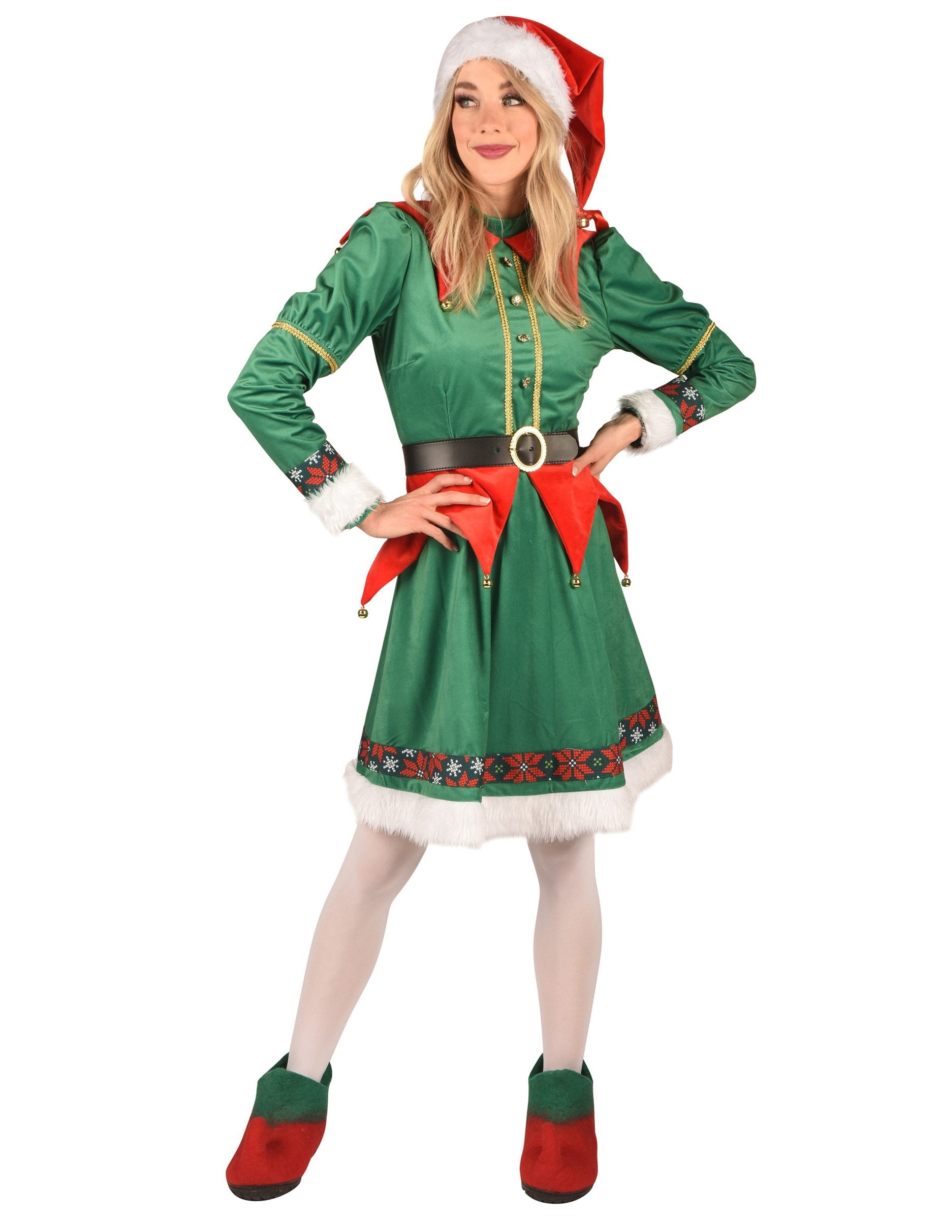 Tento luxusný vianočný elfský kostým pre ženy sa skladá zo zelenej šaty s veselými detailmi, doplnených o čiapku v rovnakom štýle a dekoratívny opasok, ktorý pekne zvýrazní pás. Tradičné farby a žiarivé detaily prinášajú skutočne čarovný nádych, ideálny na vstup do sveta škriatkov.