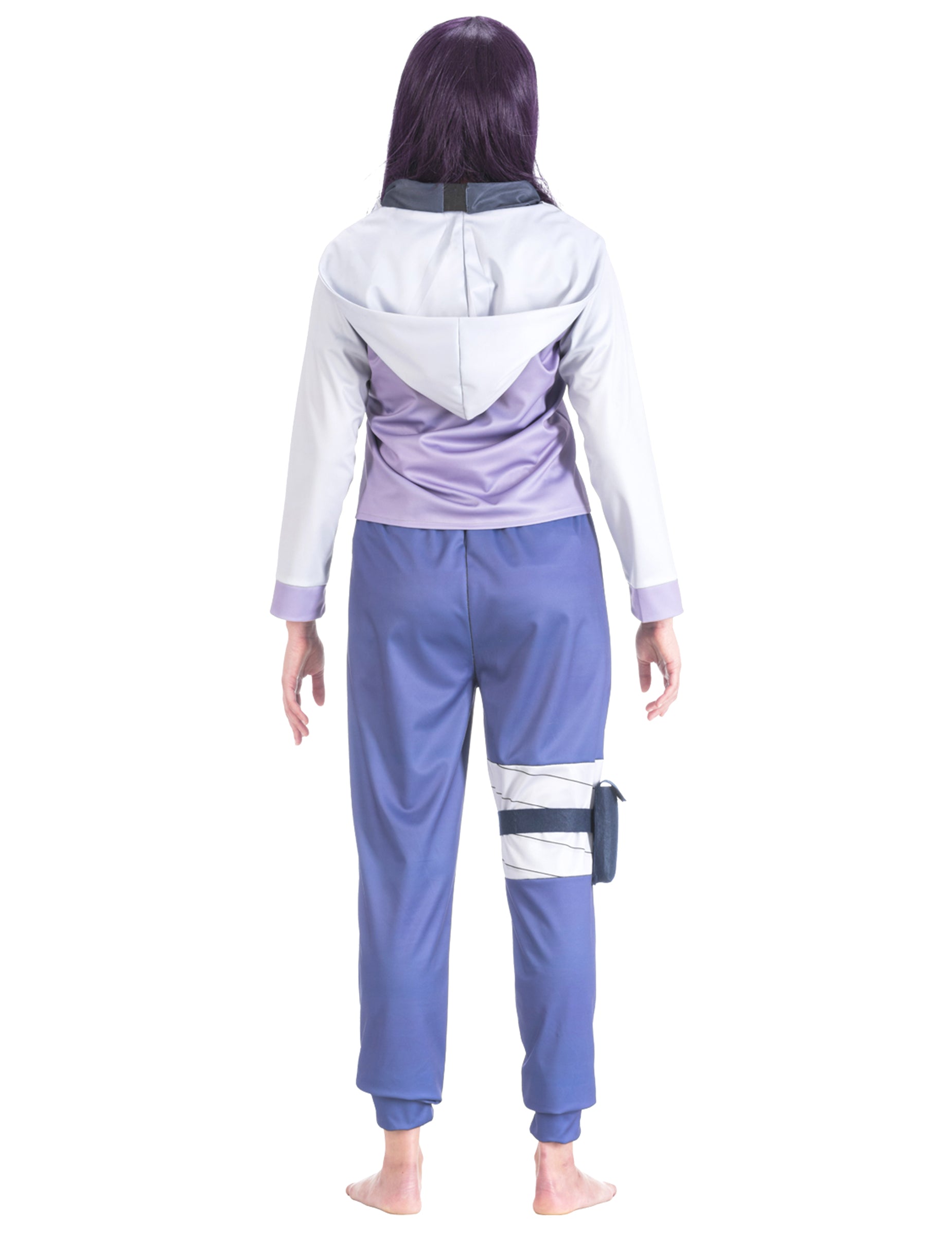 Tento dámsky kostým Hinaty Naruto obsahuje fialovú bundu, tmavý top, modré nohavice, náhrdelník a vrecko – päť kusov, ktoré dokonale vystihujú vzhľad postavy. Bunda má jemnú fialovú farbu so svetlými rukávmi, zatiaľ čo tmavý top vytvára jednoduchý kontrast. Modré nohavice majú pohodlný rovný strih. Náhrdelník zobrazuje známy symbol dediny a vrecko sa nosí na boku, aby zvýraznilo Hinatin štýl. Perfektný kostým na tematickú párty, karneval alebo narodeniny.
