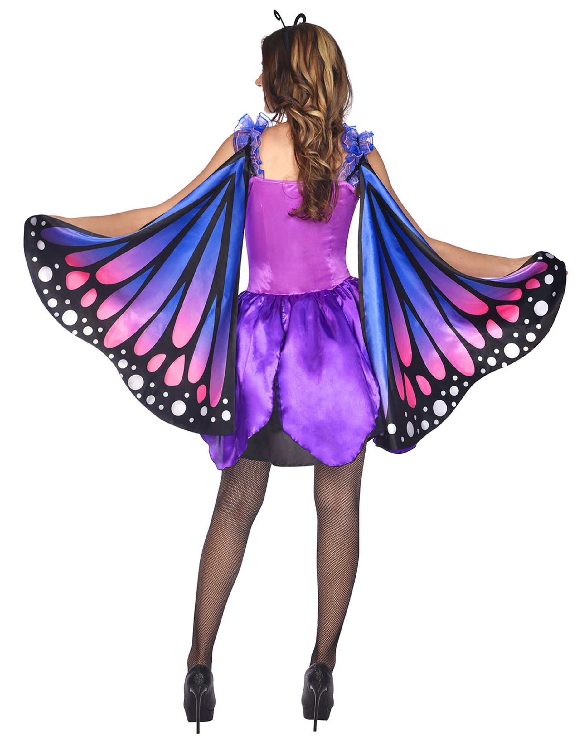 Tento dámsky kostým Tajomného motýľa obsahuje šaty v žiarivých odtieňoch fialovej, modrej a ružovej, ktoré vytvárajú éterický a očarujúci efekt. Zladené, plné krídla pripevnené k rukávom sa jednoduchým rozložením rozložia a vytvoria ľahkú a žiarivú siluetu. Perfektný outfit, ktorý upúta pozornosť na kostýmovej párty alebo karnevale.