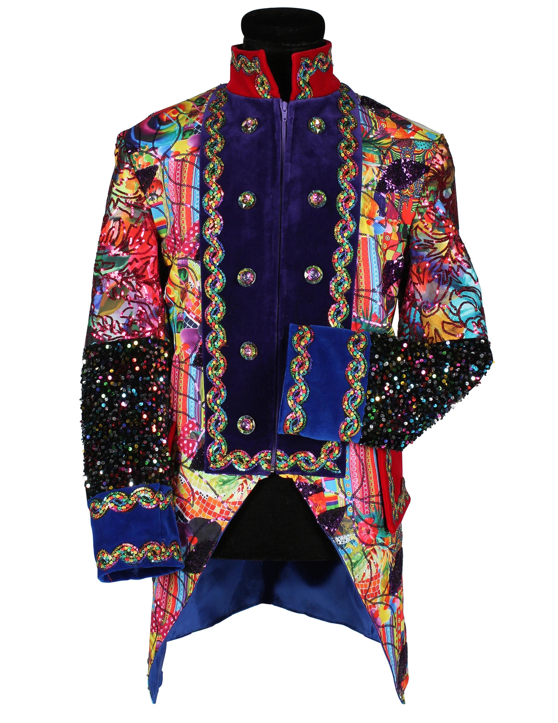 Tento pánsky karnevalový kabát Fiesta Carnavale v prémiovej kvalite s viacfarebným dizajnom okamžite upúta pozornosť svojimi žiarivými farbami a dekoratívnymi vzormi, ktoré vytvárajú slávnostný štýl. Ozdobené rukávy, zarovnané gombíky a kontrastné lemovanie dodávajú štruktúrovaný vzhľad, zatiaľ čo viacfarebné detaily prinášajú energický dojem. Vizáž zvýrazňuje siluetu a dodáva výraznú prítomnosť, ideálnu na doplnenie outfitu plného výrazu.