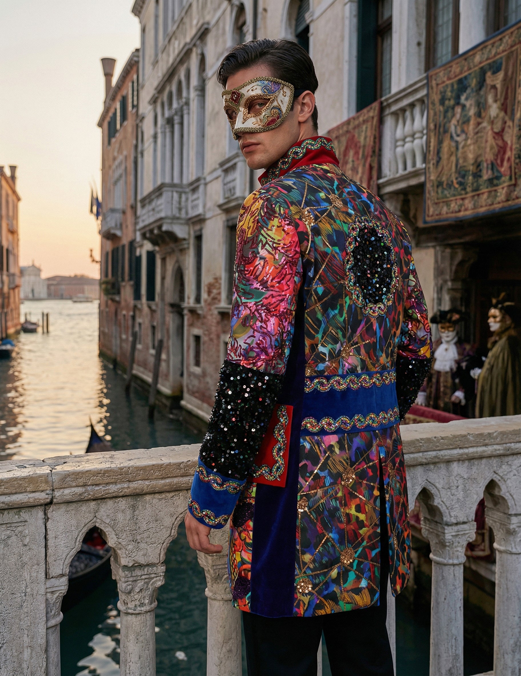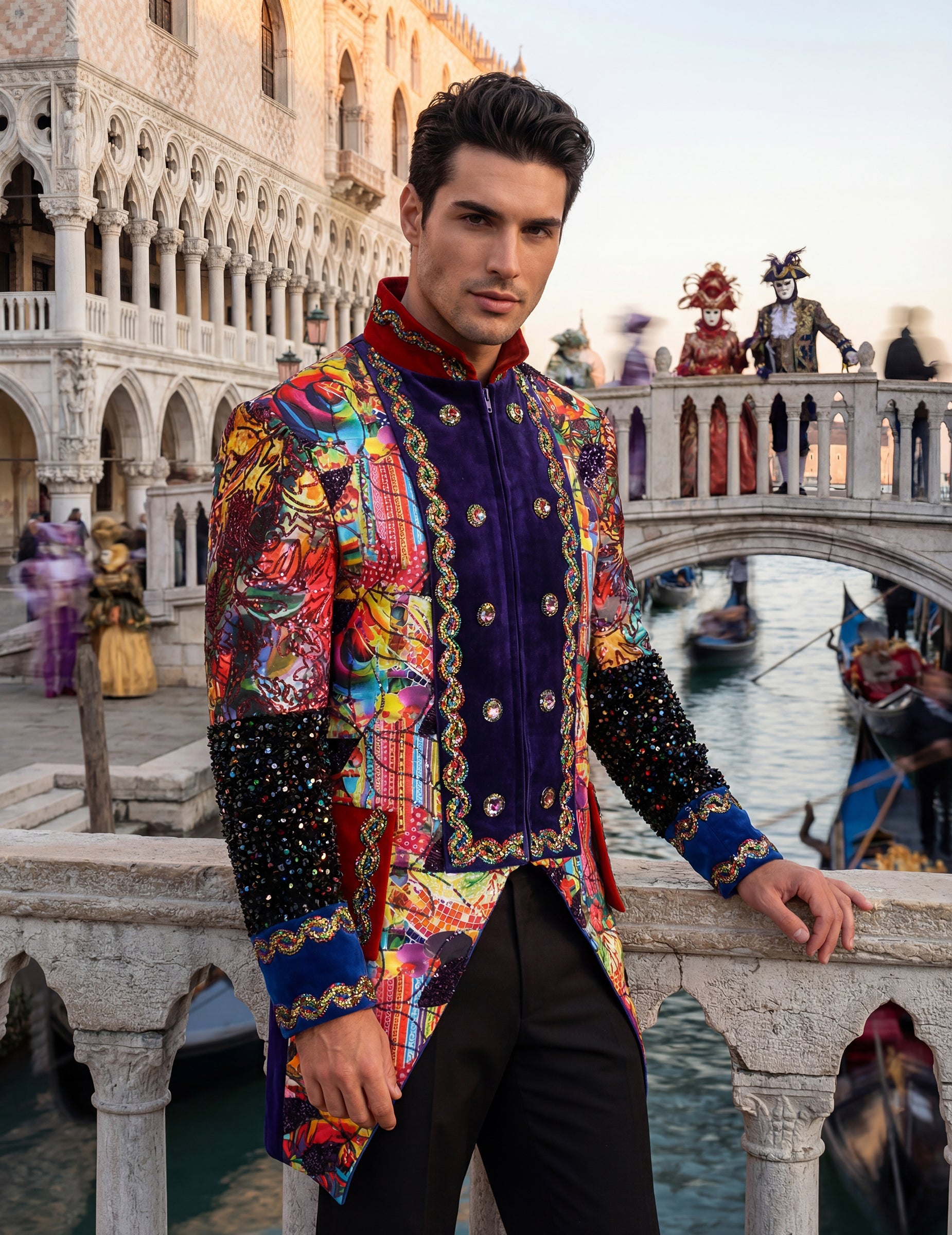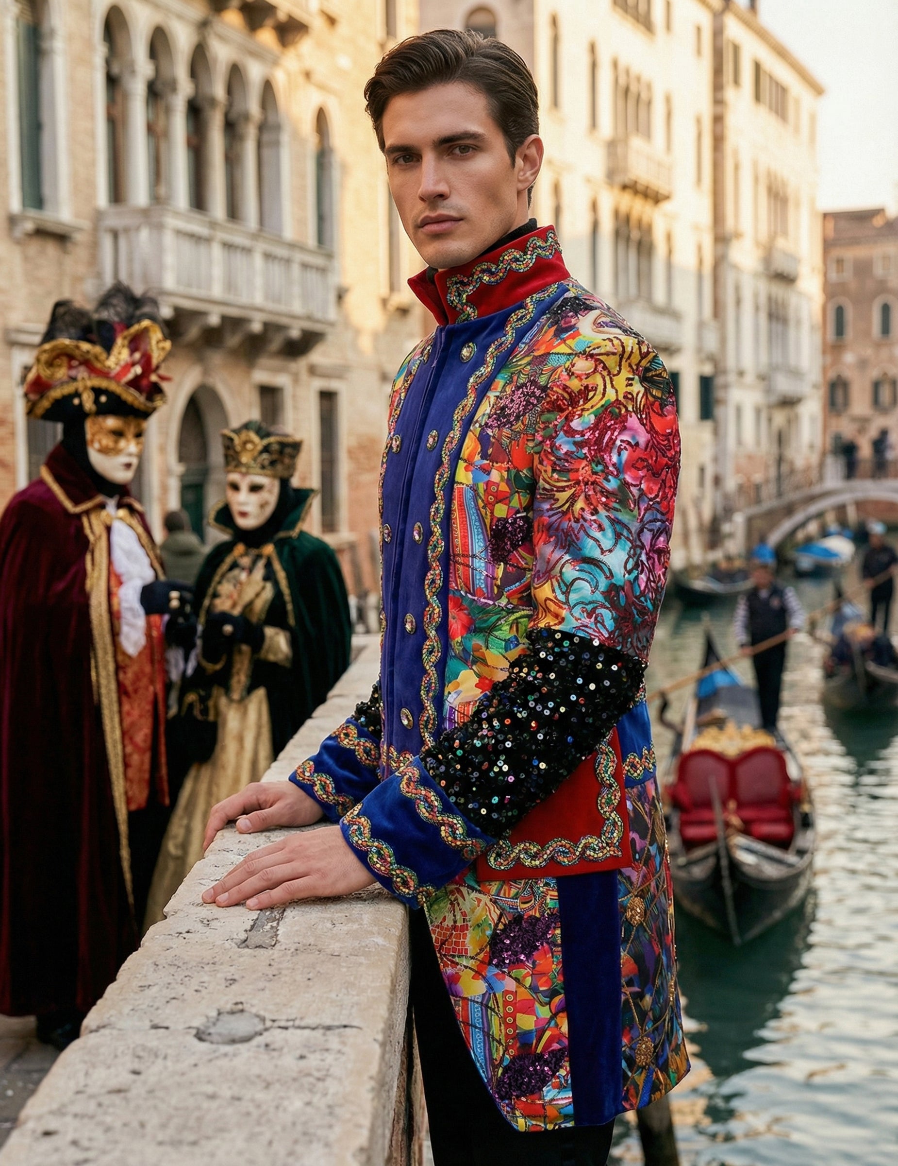 Táto prémiová, viacfarebná pánska karnevalová bunda v štýle Fiesta Carnavale okamžite upúta pozornosť svojimi žiarivými farbami a ozdobnými vzormi, ktoré vyžarujú slávnostného ducha. Zdobené rukávy, zarovnané gombíky a kontrastné lemovanie vytvárajú štruktúrovaný vzhľad, zatiaľ čo viacfarebné detaily dodávajú energický nádych. Dizajn lichotí postave a pôsobí výrazne, ideálne ako doplnok k výraznému outfitu. Je perfektná na karneval alebo kostýmovú párty a dotvára vzhľad, ktorého cieľom je urobiť štýlový dojem.