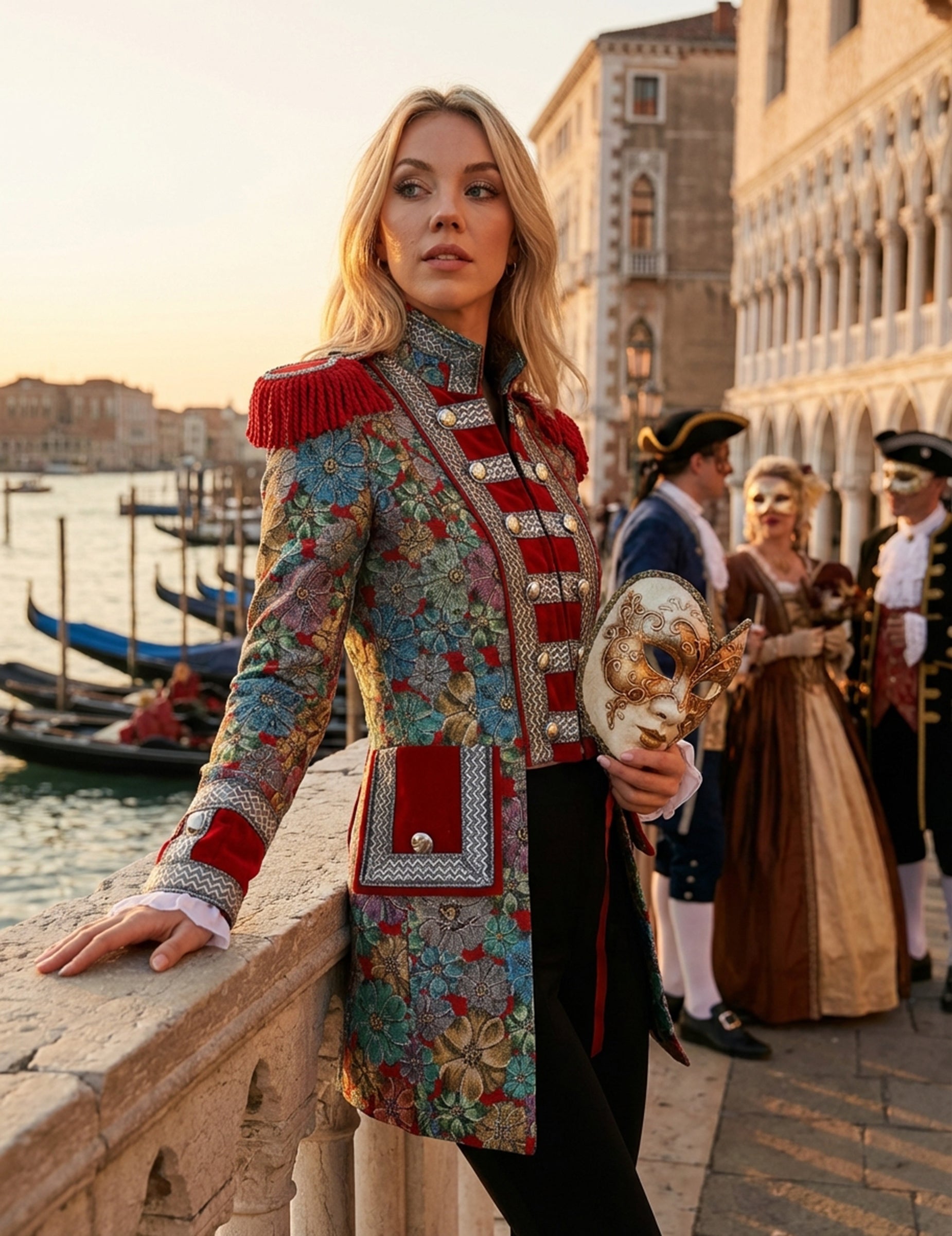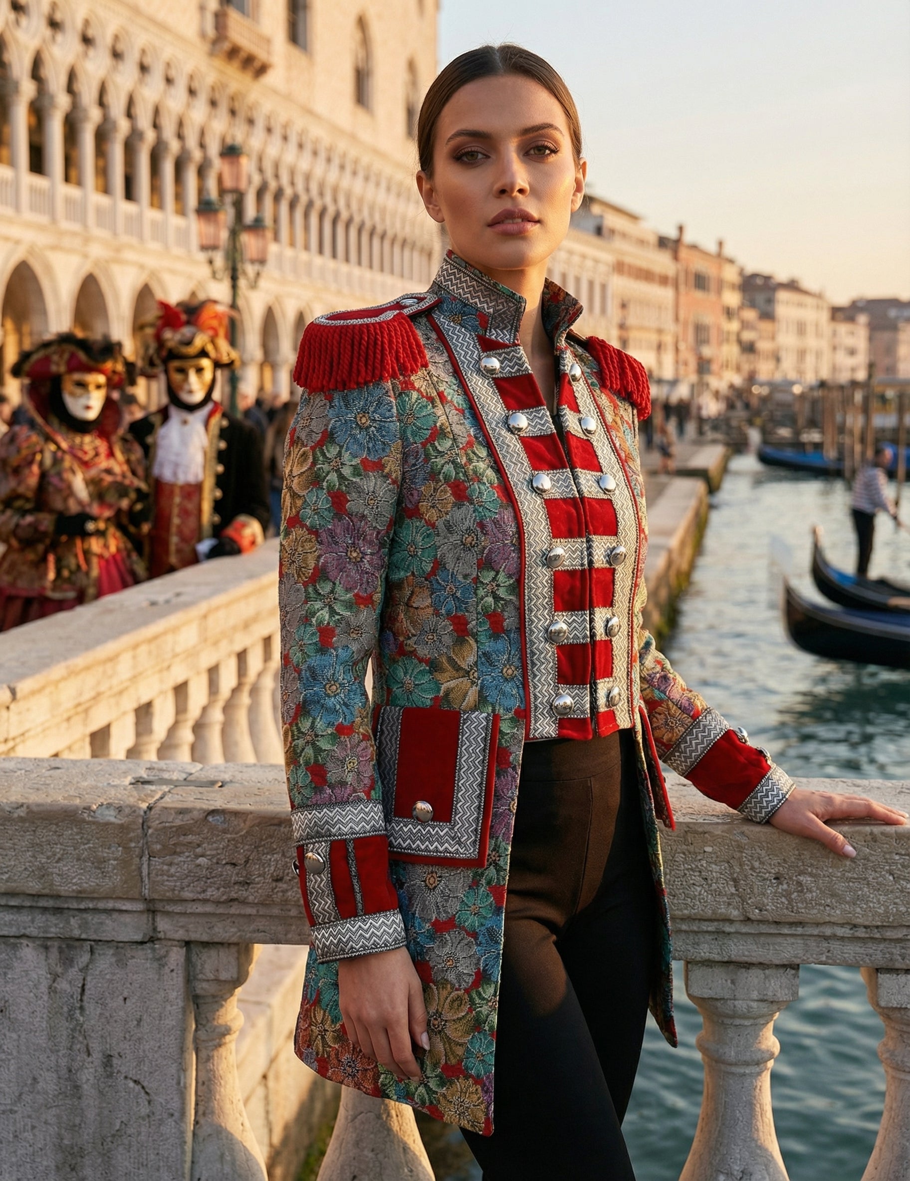 Táto prémiová dámska karnevalová bunda s kvetinovou potlačou vyniká svojimi žiarivými farbami a pútavými ozdobnými motívmi. Jej elegantný strih zvýrazňuje ramená červenými ozdobami, zatiaľ čo kvetinové detaily dodávajú nádych elegancie. Kontrast medzi lemom a ozdobnými pásikmi vytvára harmonický a charakteristický vzhľad, ideálny pre slávnostný outfit. Je to ideálny kúsok na karneval alebo akúkoľvek oslavu, kde chcete predviesť sebavedomý a elegantný štýl.