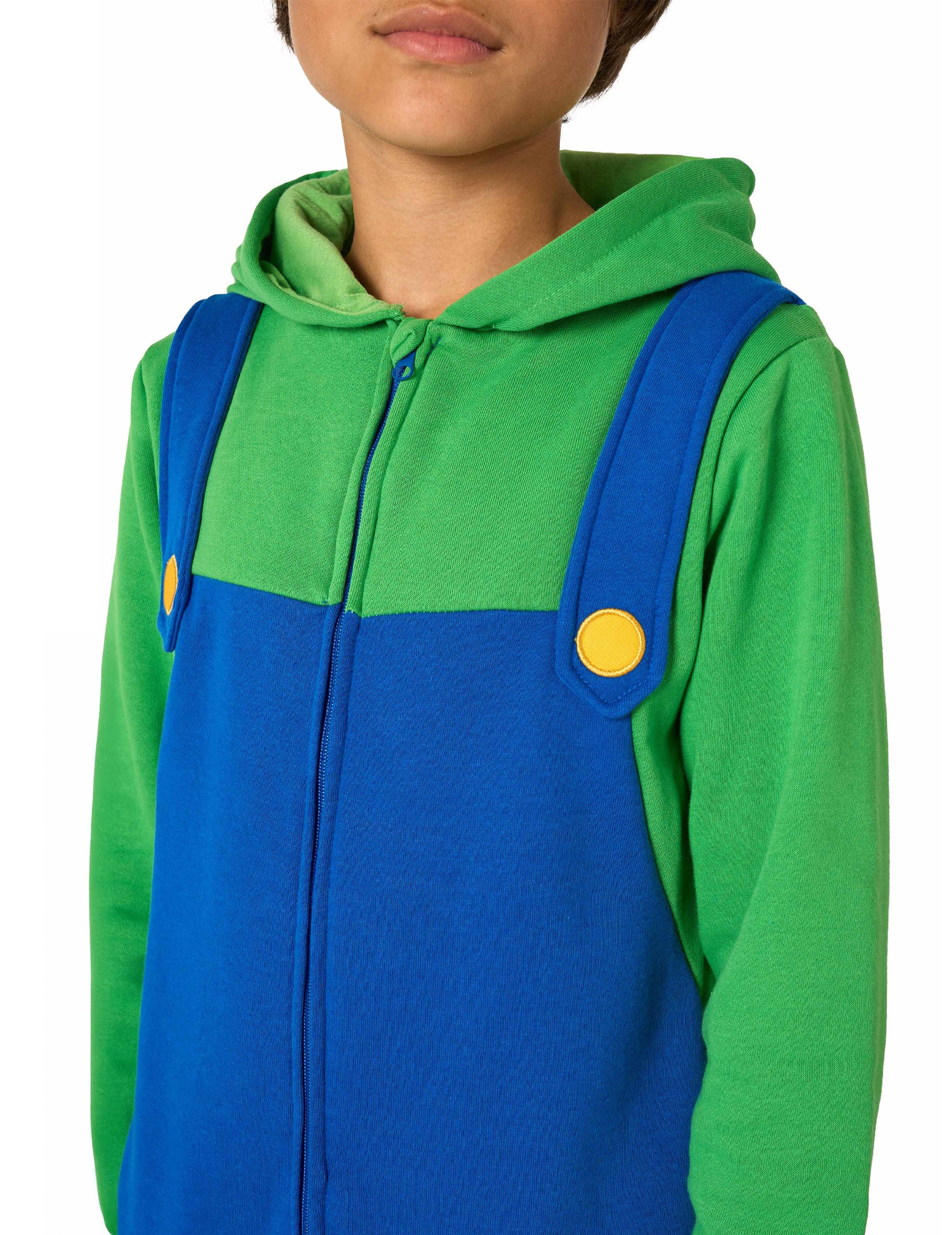 Cette combinaison Luigi enfant mélange un haut vert muni d’une capuche marquée d’un grand L et une partie basse bleue qui rappelle l’effet salopette du personnage. Les bretelles imprimées et les pastilles jaunes apportent le détail visuel qui fait immédiatement penser au célèbre frère du héros moustachu. Sa coupe ample permet de bouger facilement et donne un rendu fluide, agréable à porter tout au long de la journée. La fermeture située sur l’avant permet d’enfiler la combinaison en un geste, tout en conservant l’apparence continue du costume. Une fois portée, elle offre un style reconnaissable entre tous, avec des couleurs vives et les motifs associés à Luigi. Cette combinaison Luigi sera idéale pour apporter une touche de jeu vidéo lors d’un anniversaire, d’un Carnaval ou de tout moment festif tourné vers l’univers des héros du Royaume Champignon.