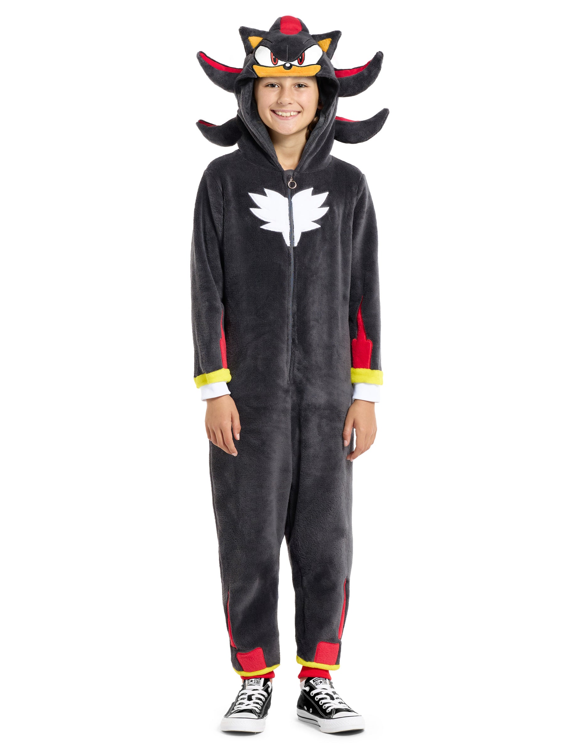 Kapucňa zobrazuje výrazné črty Shadow™ s jeho ušami a typickými prameňmi vlasov, zatiaľ čo biely plastrón vytvára výrazný kontrast v strede. Mäkká textúra a voľný strih umožňujú hrať sa, behať a pohybovať sa ľahko, pričom si zachováte rozpoznateľný vzhľad tohto ikonického hrdinu. Predné zapínanie zaručuje jednoduché obliekanie a jednotný vzhľad hneď po zapnutí.