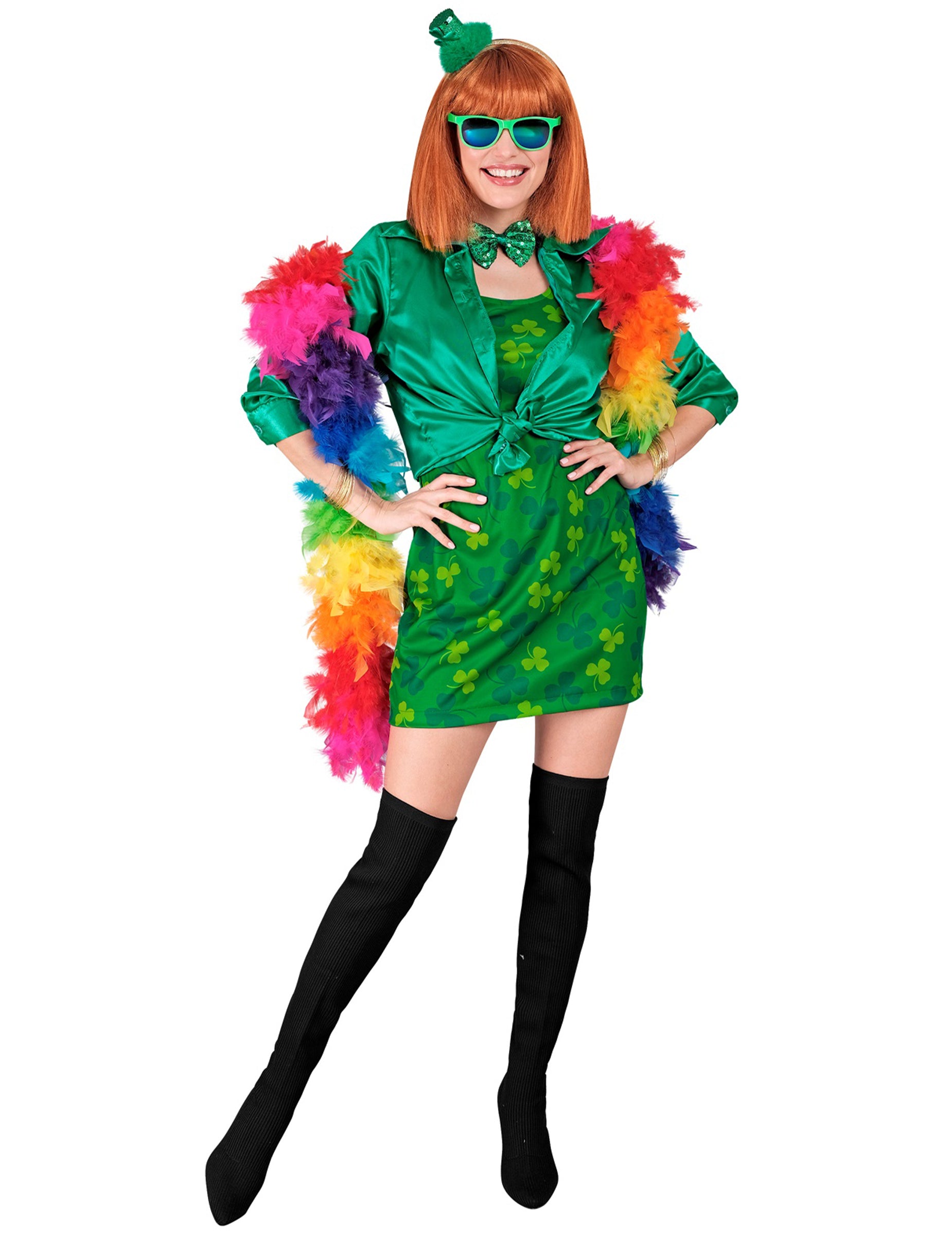 Táto krátka dámska šaty s trojlístkami na Svätého Patrika prináša veselý nádych vďaka svojej žiarivej zelenej farbe a motívom trojlístkov rozptýleným po celom povrchu. Jej krátky strih zvýrazňuje postavu a zároveň ponúka jednoduchý a svieži štýl, ideálny na oslavu tohto ikonického sviatku. Ľahké a príjemné na nosenie, predstavujú dokonalý kostým na večierok v štýle Svätého Patrika alebo na dodanie slávnostného nádychu vášmu vzhľadu.