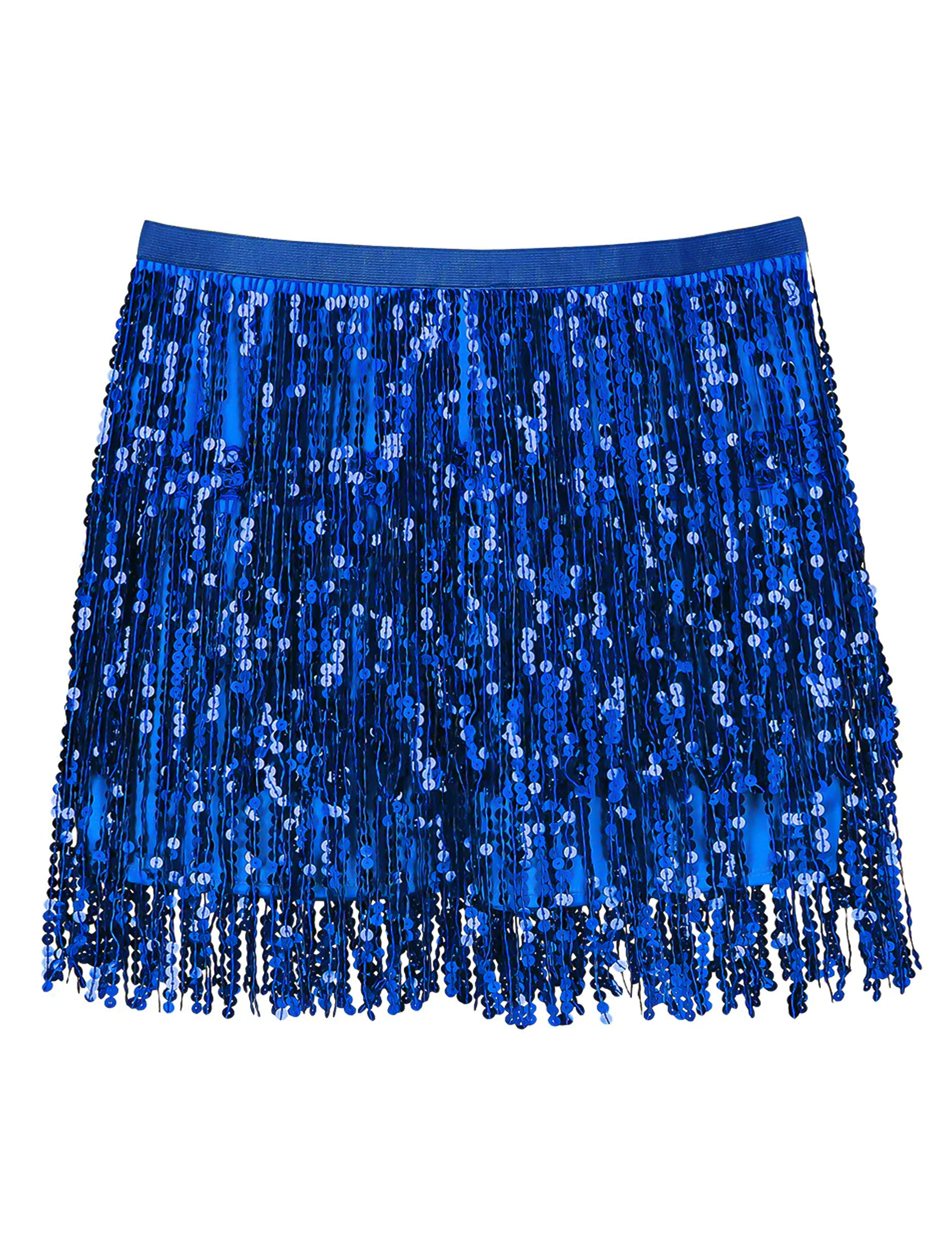 Táto modrá flitrovaná mini sukňa pre ženy vyniká svojou hlbokou farbou a flitrami, ktoré zachytávajú svetlo.