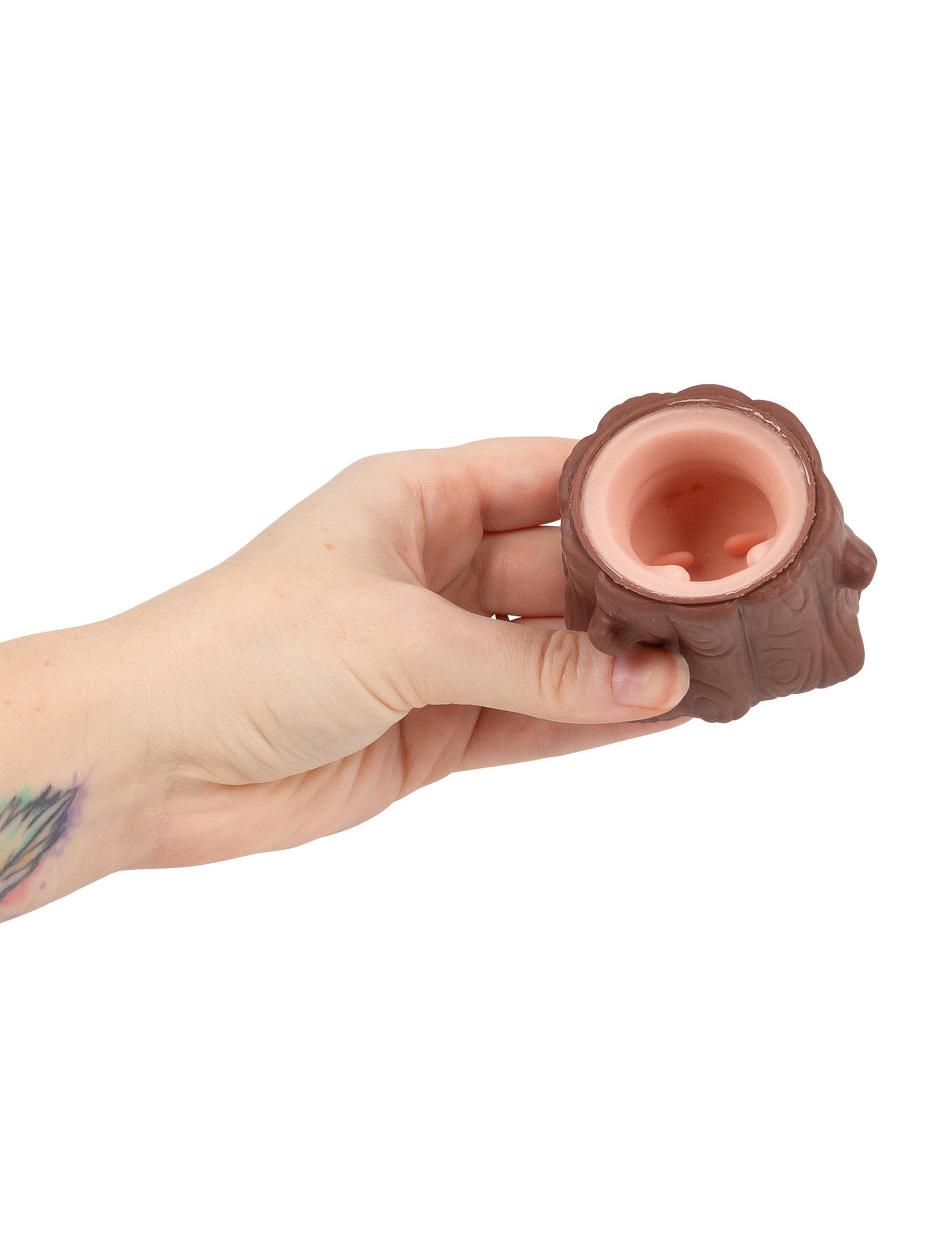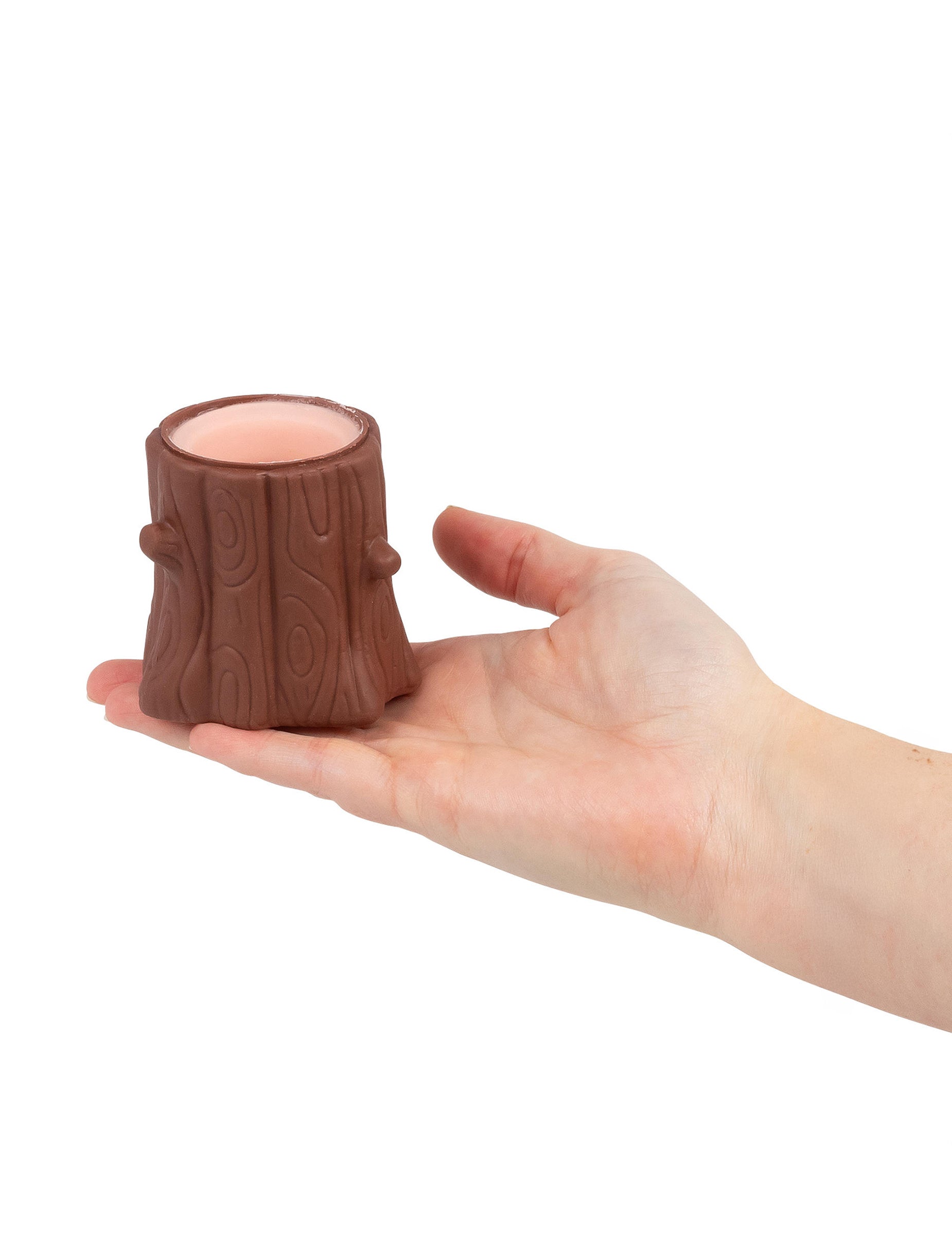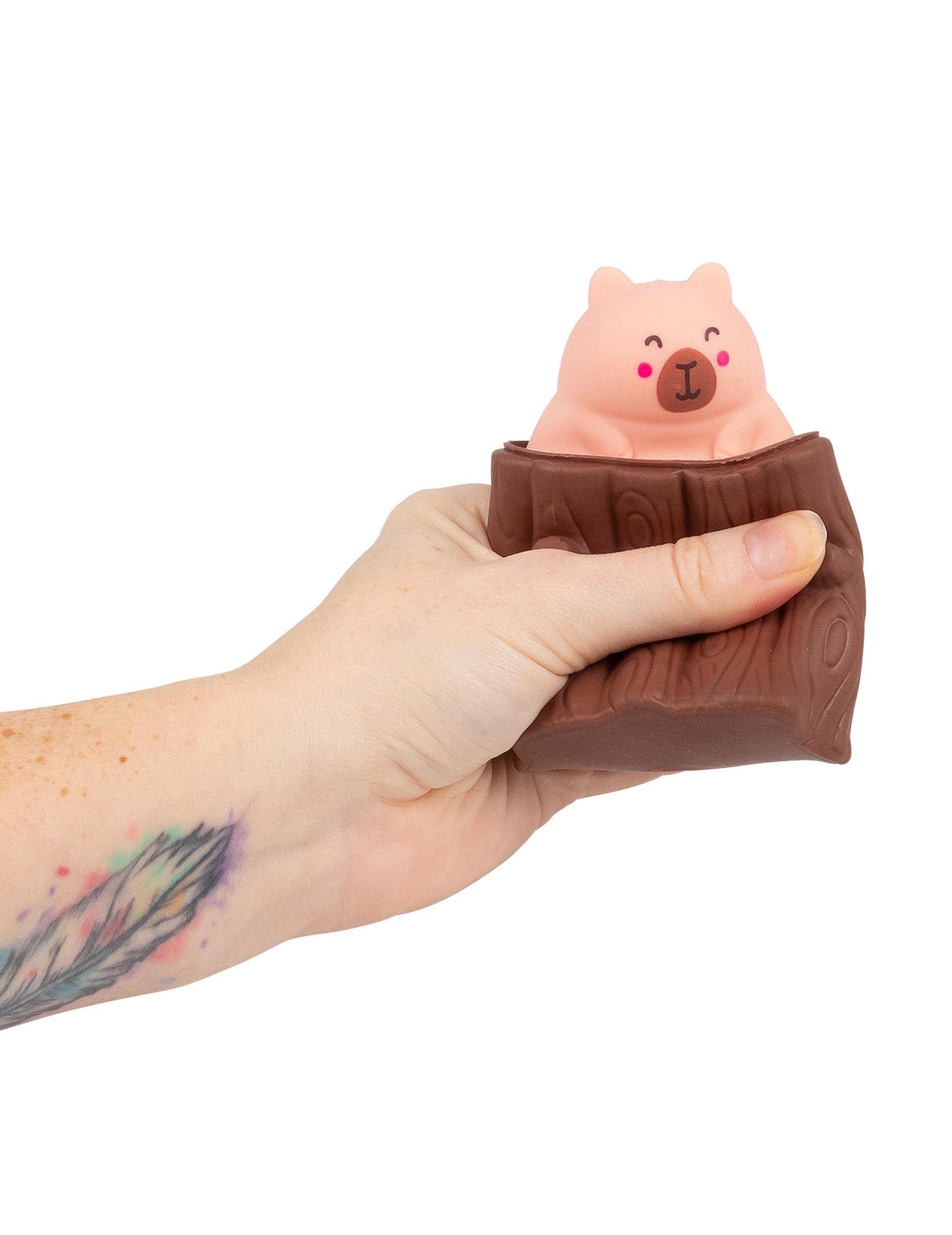 Hnedý podklad evokuje tvar kmeňa stromu alebo úkrytu a jeho mäkká textúra sa medzi prstami ľahko deformuje. S každým stlačením sa ružová kapybara zdvihne a po uvoľnení tlaku zmizne, čím vzniká jednoduchý a zábavný efekt.