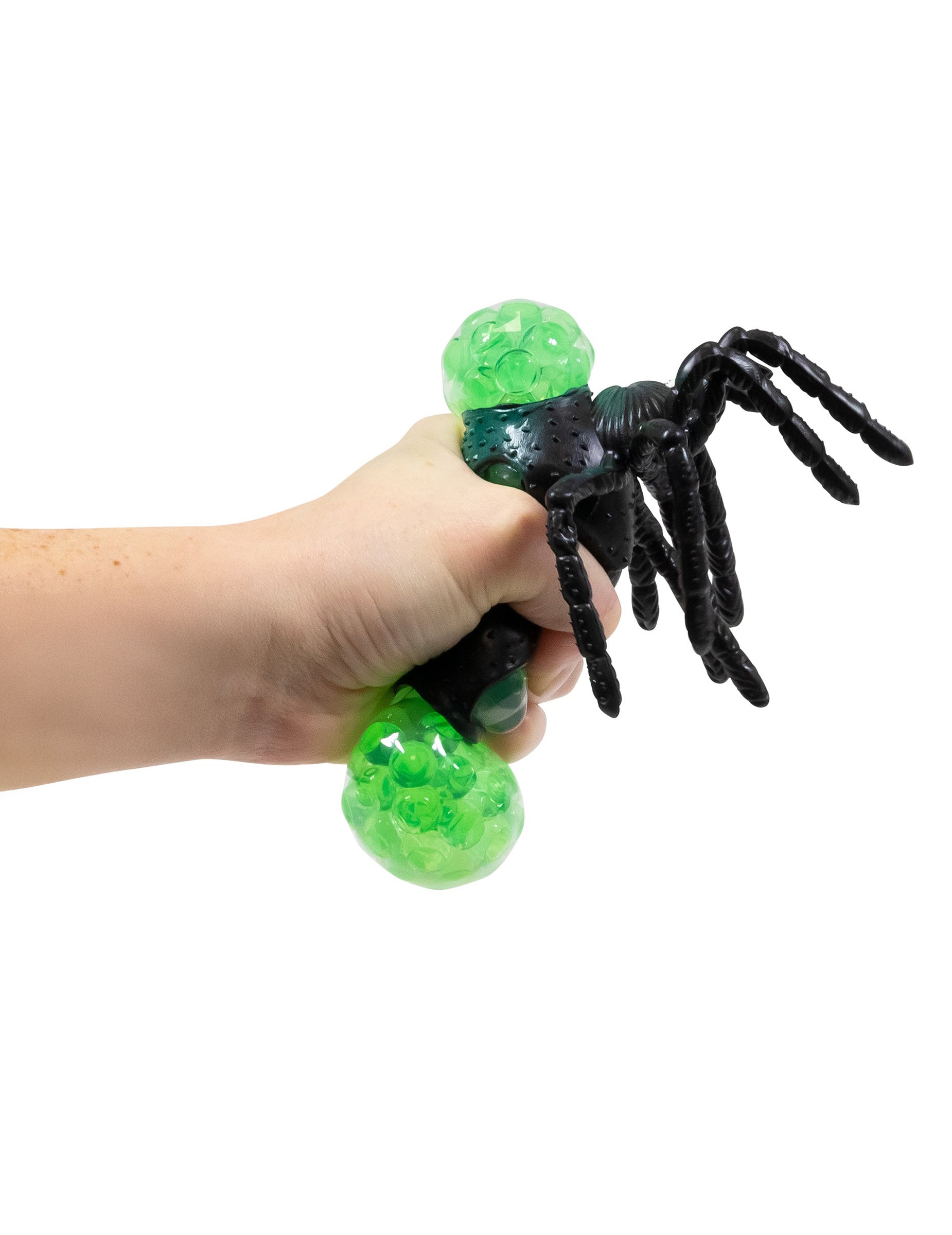Táto mäkká guľôčková pavúčica je vyrobená z pružného materiálu, ktorý sa ľahko deformuje v ruke. Má vypuklé telo naplnené malými guľôčkami, ktoré sú viditeľné, keď ju stlačíte. Tenké nožičky a jemne zrnitá textúra zvýrazňujú jej vzhľad.