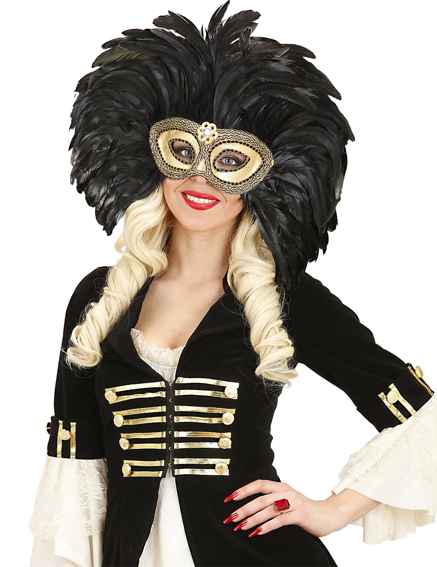 Zlatá farba vytvára svietivý efekt, ktorý sa ľahko kombinuje s párty outfitom. Veľké množstvo čiernych pierok na vrchu dodáva objem a vytvára pôsobivý vzhľad. Malá zlatá ozdoba dodáva stredu masky finálny nádych.