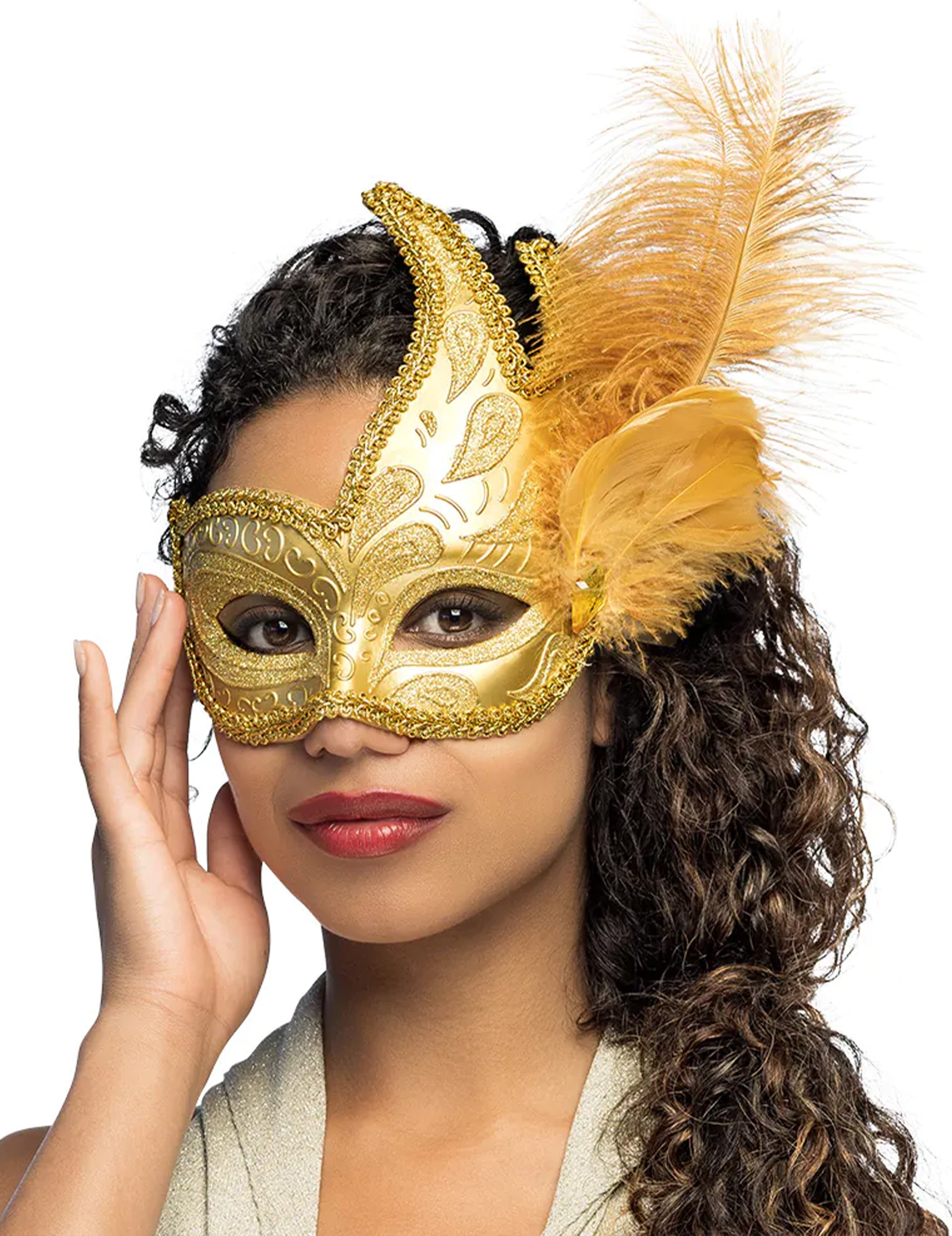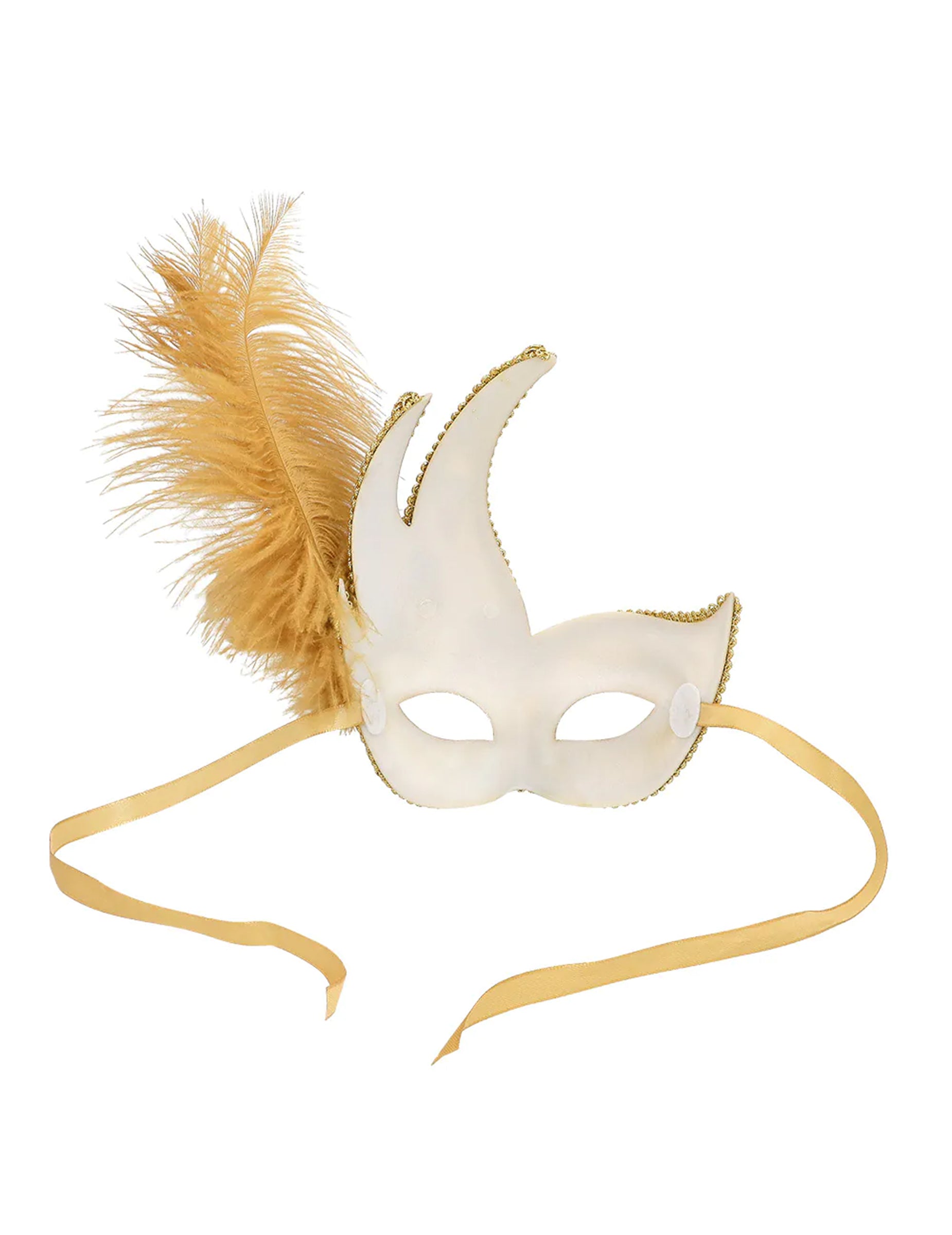 Na boku ľahké pierko v kombinácii s malou tón v tóne dekoráciou pridáva objem a rafinovaný nádych. Okraje masky sú zdobené zlatým lemovaním, ktoré posilňuje jej slávnostný vzhľad.