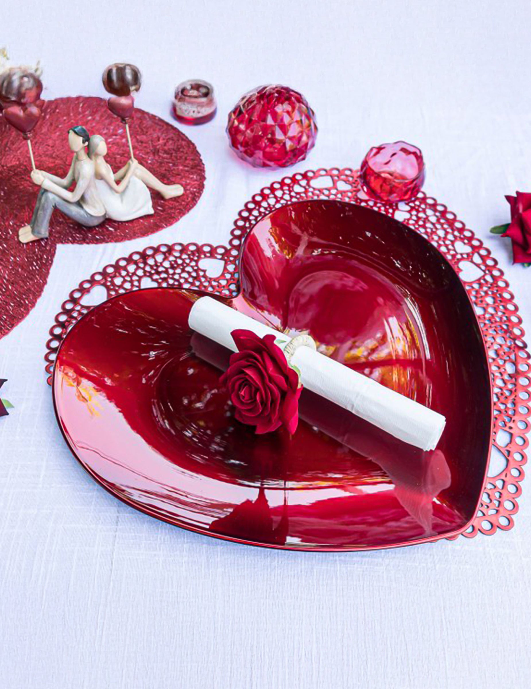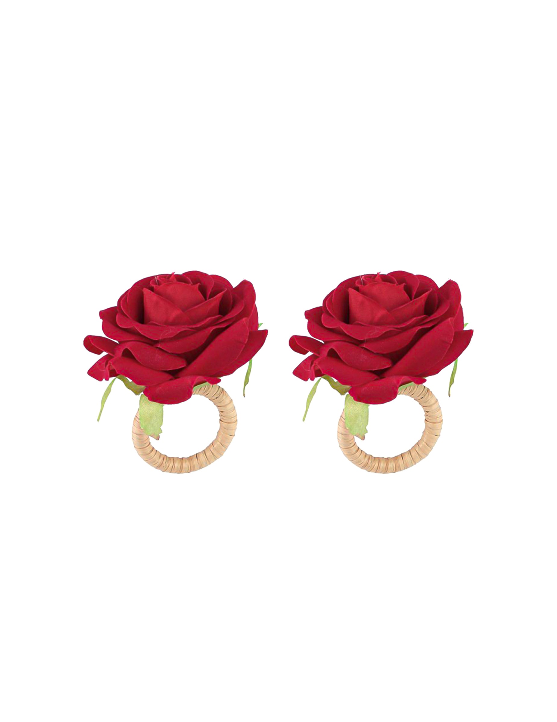Reliéfny kvet púta pozornosť a vytvára výrazný kontrast s obrúskom, zatiaľ čo okrúhly krúžok zaisťuje úhľadné uchytenie. Ich červený odtieň sa ľahko začlení do romantickej výzdoby alebo tematických udalostí.