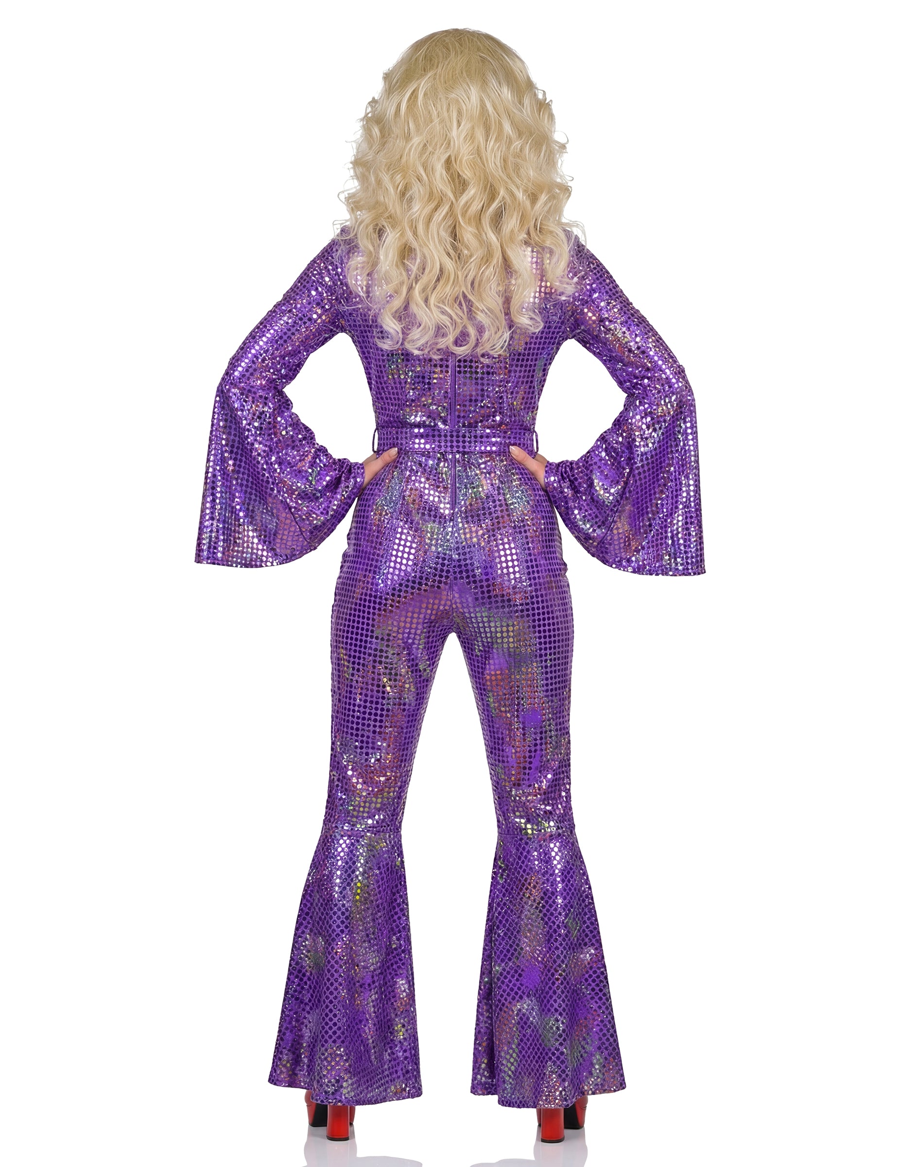 Tam dámsky disko overalfialová Umožní vám vytvoriť si kompletný retro outfit, ideálny na slávnostné udalosti a tematické večierky. Jeho dizajn sa perfektne hodí do disco sveta s okamžite rozpoznateľnou farbou.