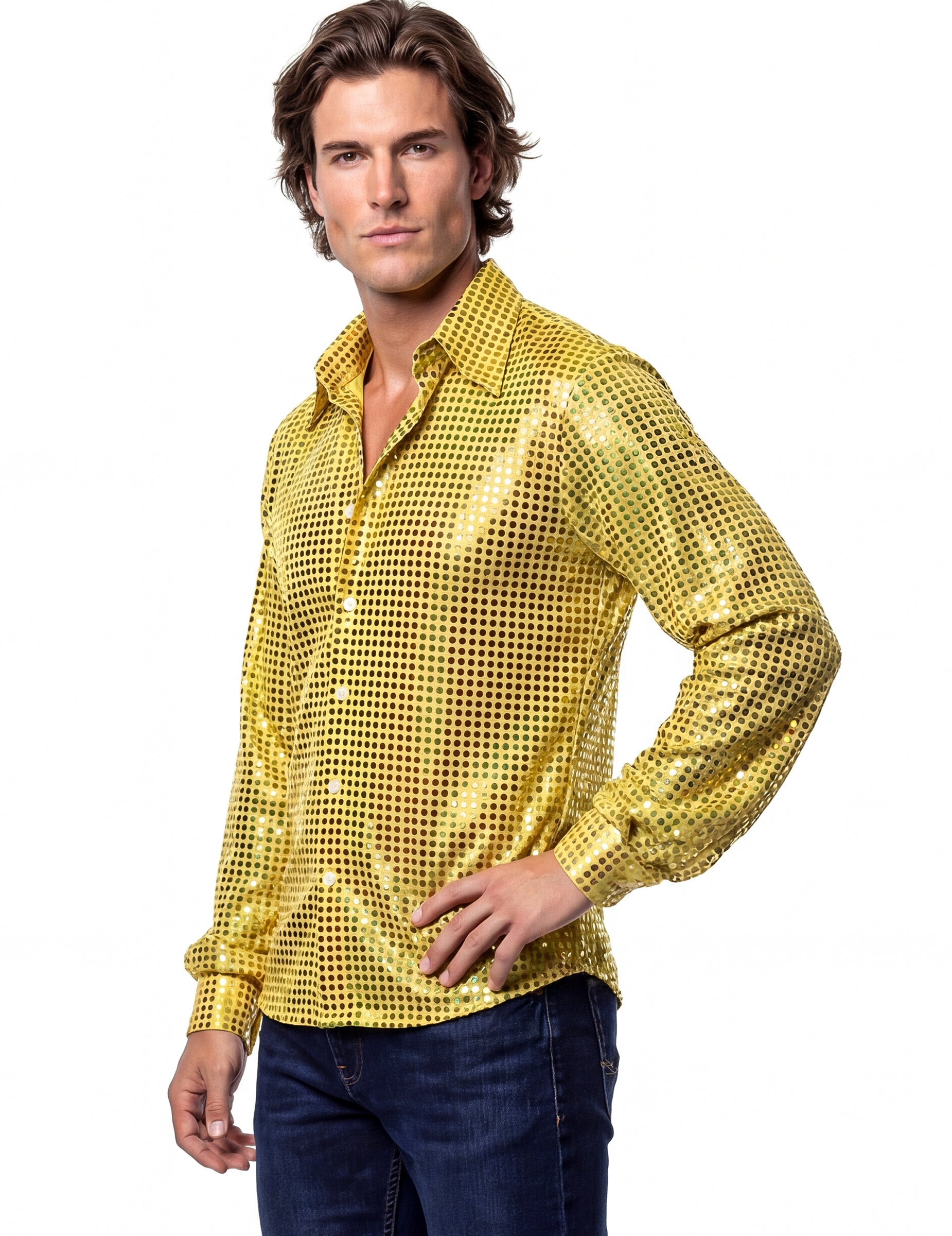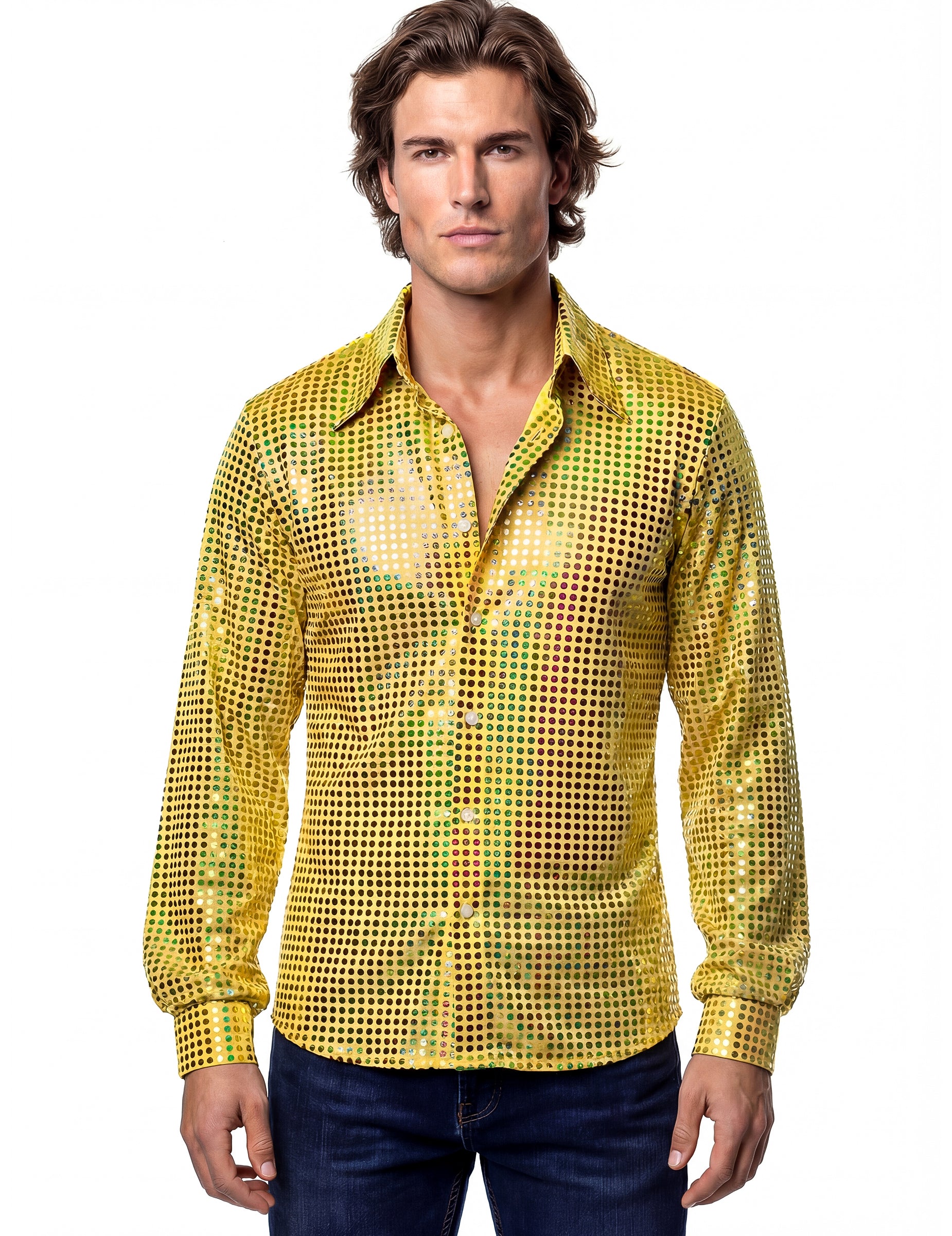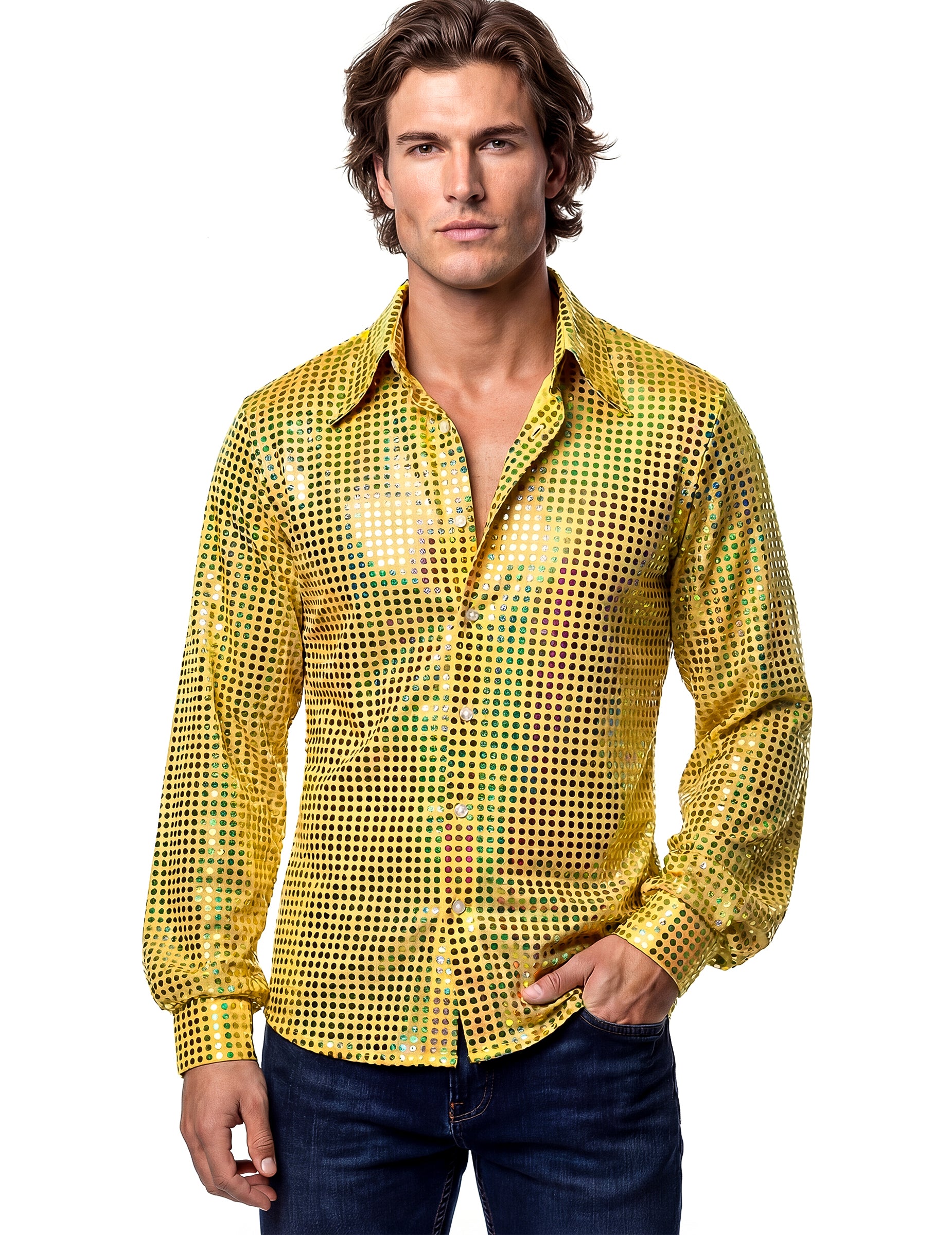 Tam pánske žlté disko tričko Vďaka tomu si môžete vytvoriť slávnostný outfit inšpirovaný 70. rokmi, ideálny na tematické večierky a kostýmové akcie. Jeho dizajn jasne odráža disko estetiku.