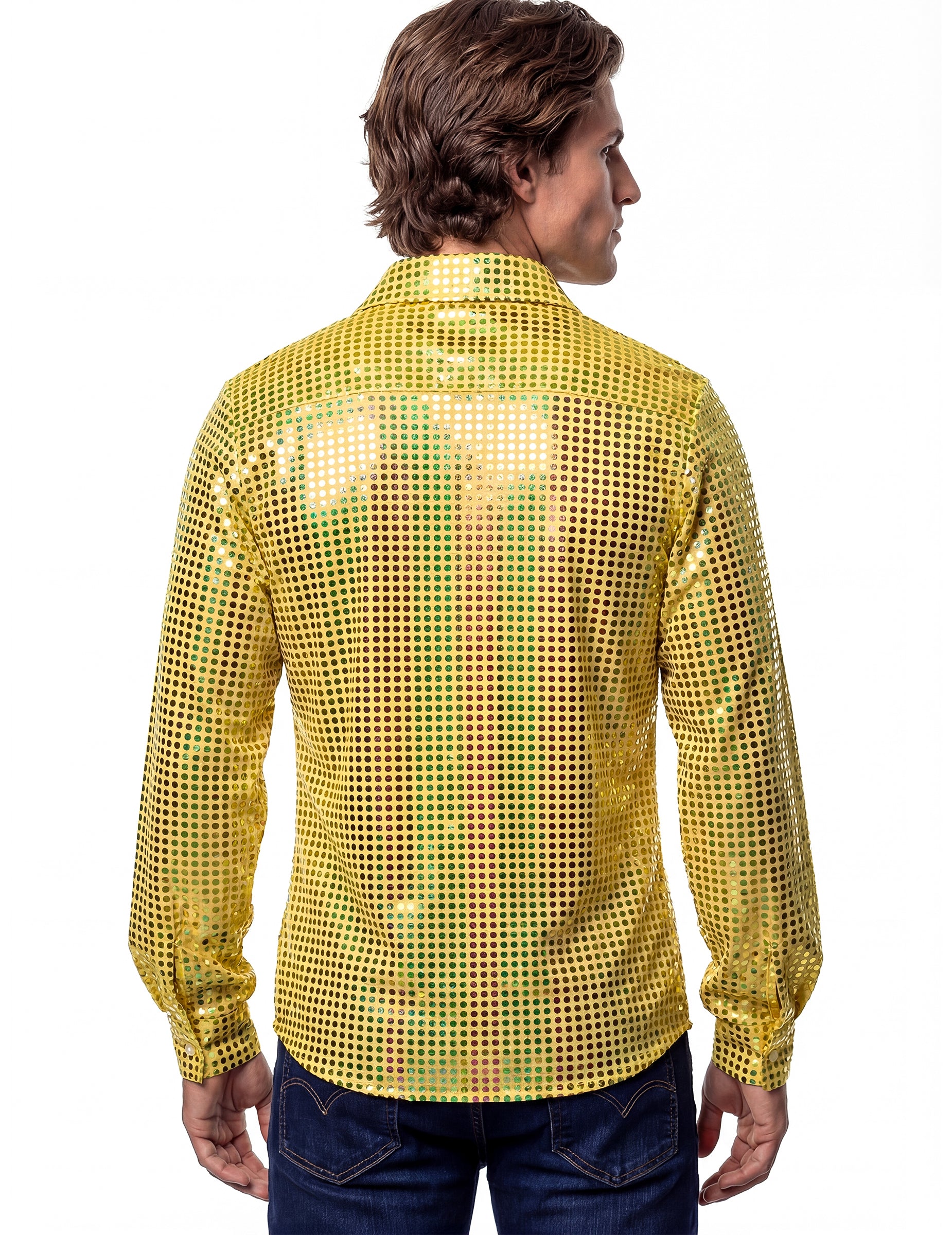 Tričko má po celej svojej ploche jasne žltý vzor, ktorý vytvára svetelný efekt, ktorý sa mení v závislosti od osvetlenia. Jeho rovný strih, dlhé rukávy a otvorený golier sú typické pre disko oblečenie. Mäkká látka sa s vami pohybuje a lichotí vašej postave na tanečnom parkete.