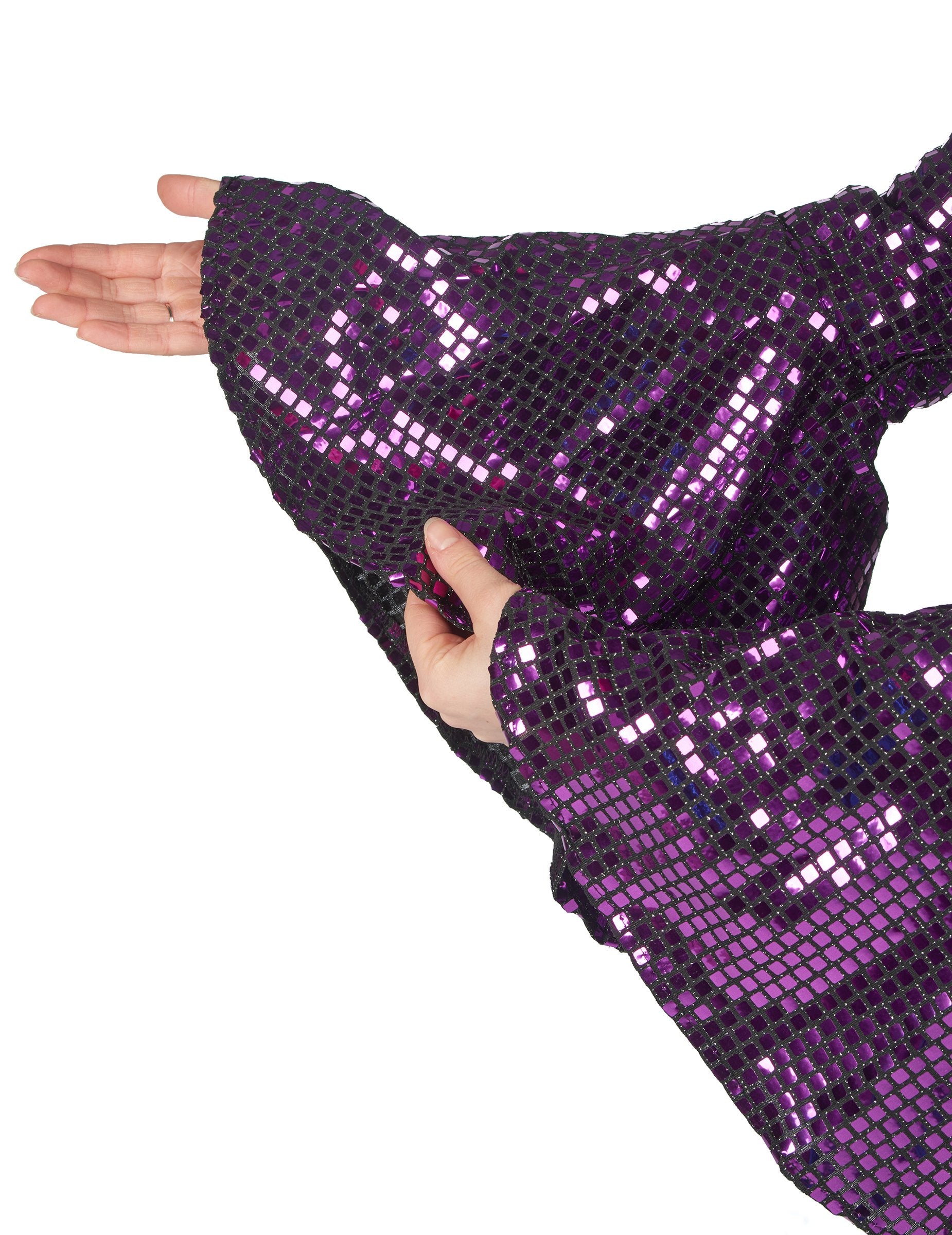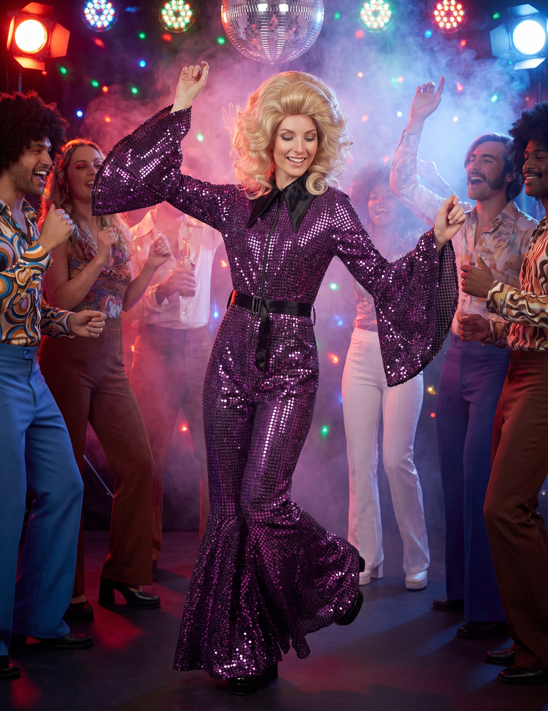 Tam Dámsky fialový disko overal S opaskom vám umožní vytvoriť kompletný outfit v retro štýle, ideálny na tematické večierky a večery inšpirované 70. rokmi. Jeho výrazná farba sa perfektne hodí do disco sveta.