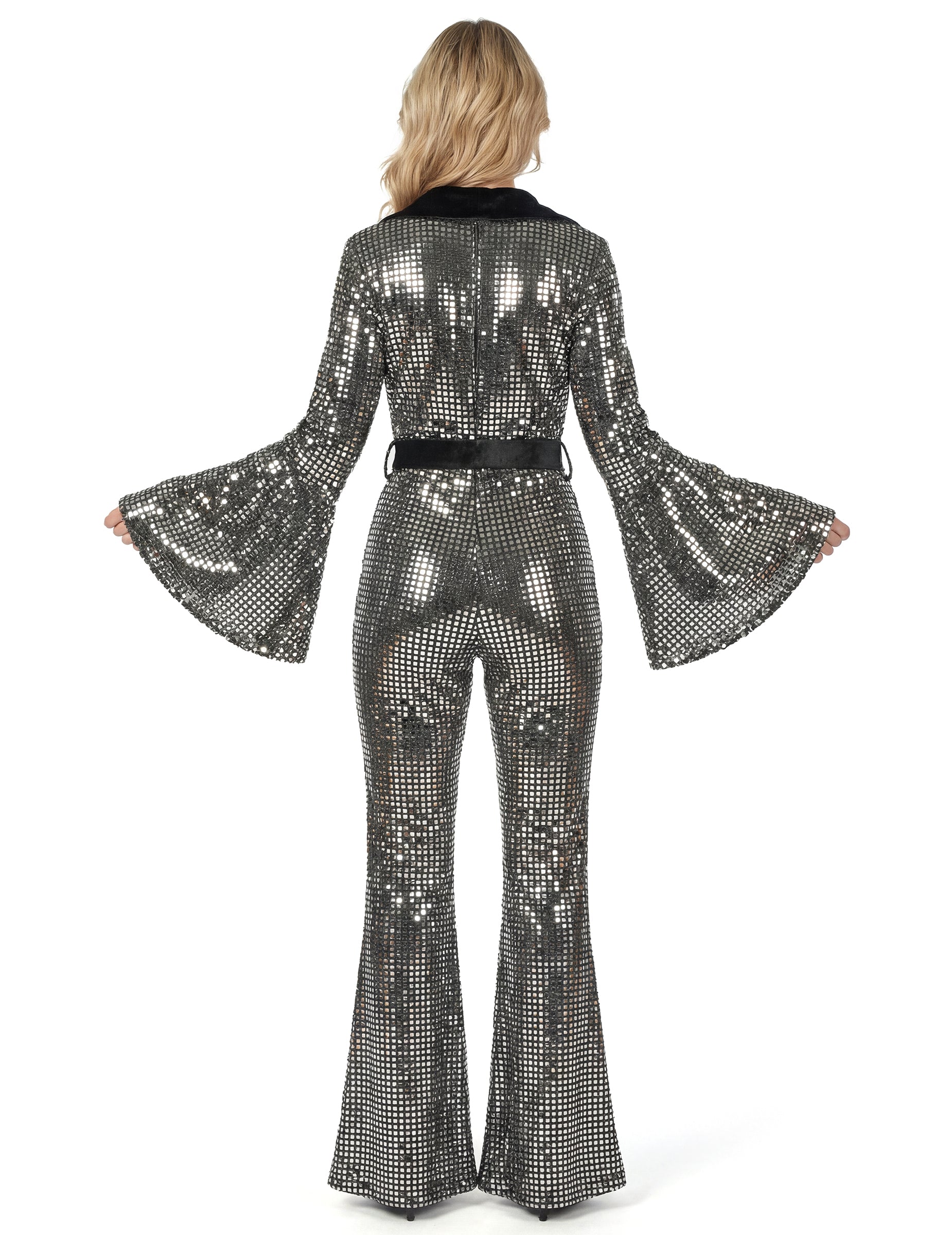 Overal sa vyznačuje trblietavým strieborným vzorom po celej dĺžke. Priliehavý vrch je lemovaný zladeným opaskom, ktorý opticky zvýrazňuje pás. Dlhé, rozšírené rukávy dodávajú objem, zatiaľ čo zvonové nohavice predlžujú siluetu. Výstrih do V a priliehavý strih na hrudi evokujú štýl diskotéky 70. rokov.
