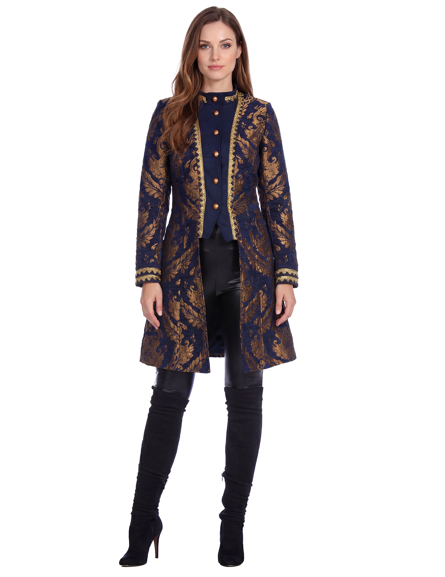 Táto modrá bunda sa vyznačuje zlatými vyšívanými motívmi rozmiestnenými po celej látke, ktoré vytvárajú výrazný vizuálny kontrast. Priliehavý strih štruktúruje siluetu, zatiaľ čo dlhé rukávy a stojačik evokujú dress code barokového obdobia. Dekoratívne detaily na prednej strane a manžetách umocňujú rafinovaný vzhľad odevu.
